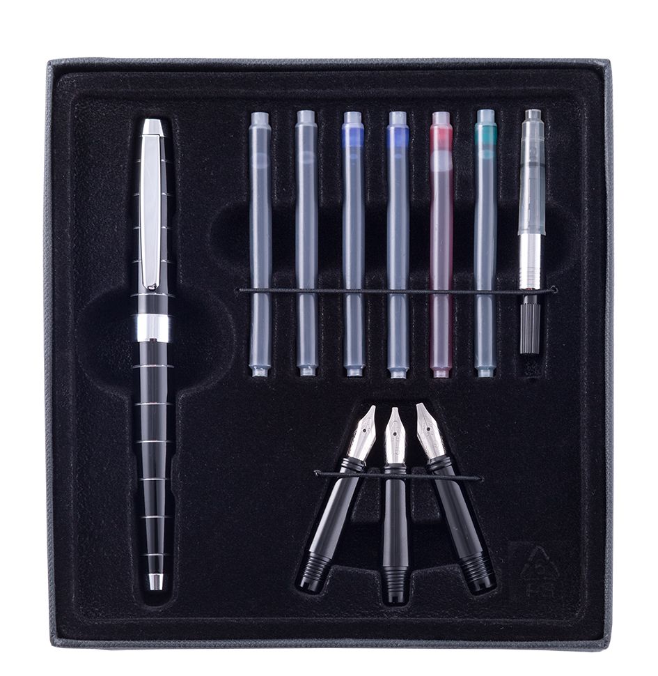 В набор входит: 1 классическая перьевая ручка, 3 сменные грип-секции с ширококонечными перьями 1.1, 1.5 и 1.9 мм, 6 картриджей с чернилами чёрного, синего, красного и зелёного цветов, конвертор, а также вкладыш-инструкция с примерами письм
