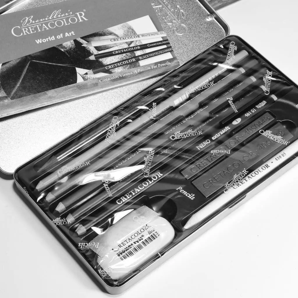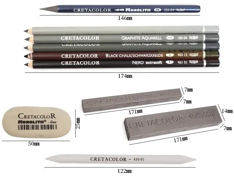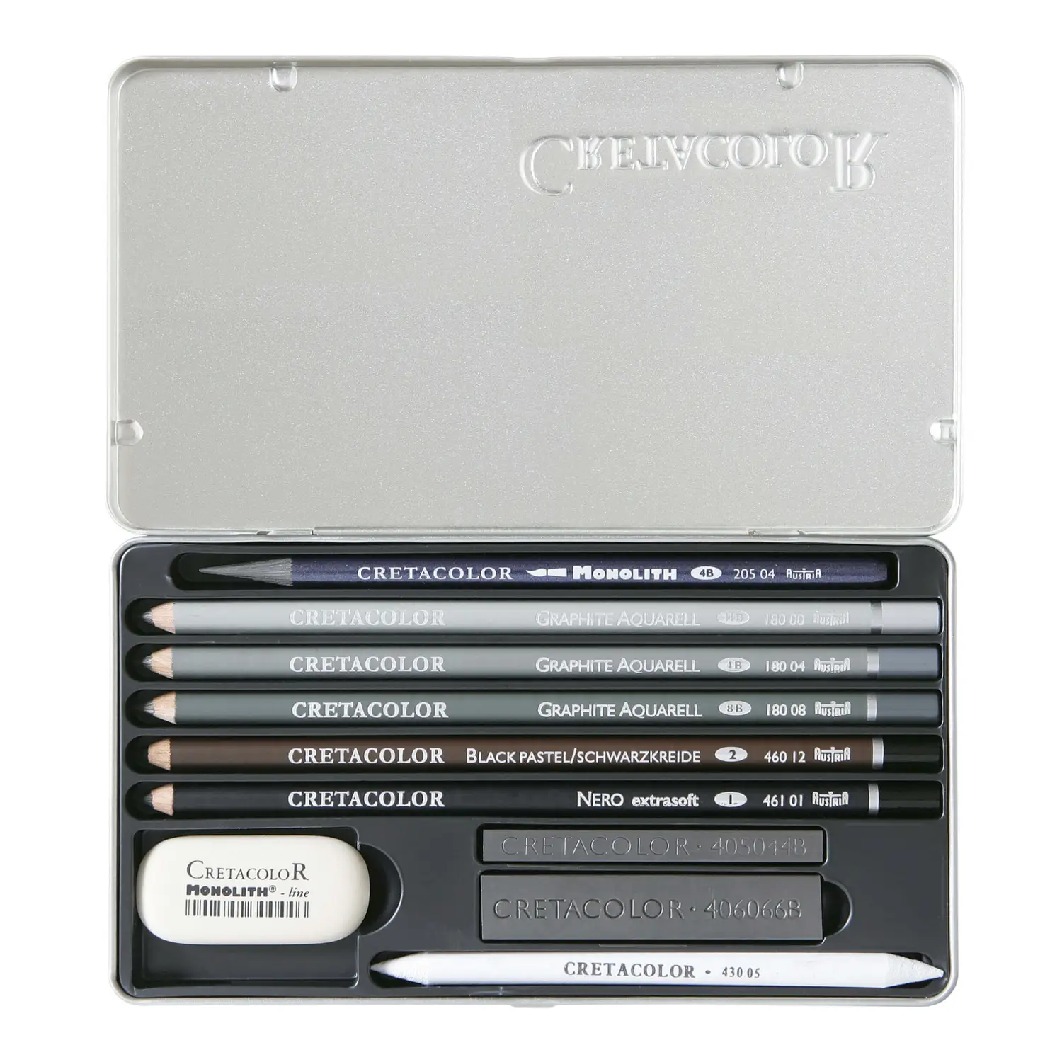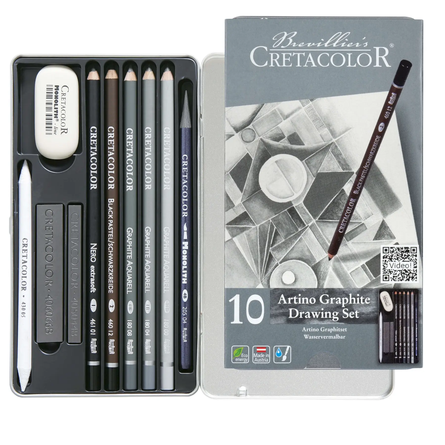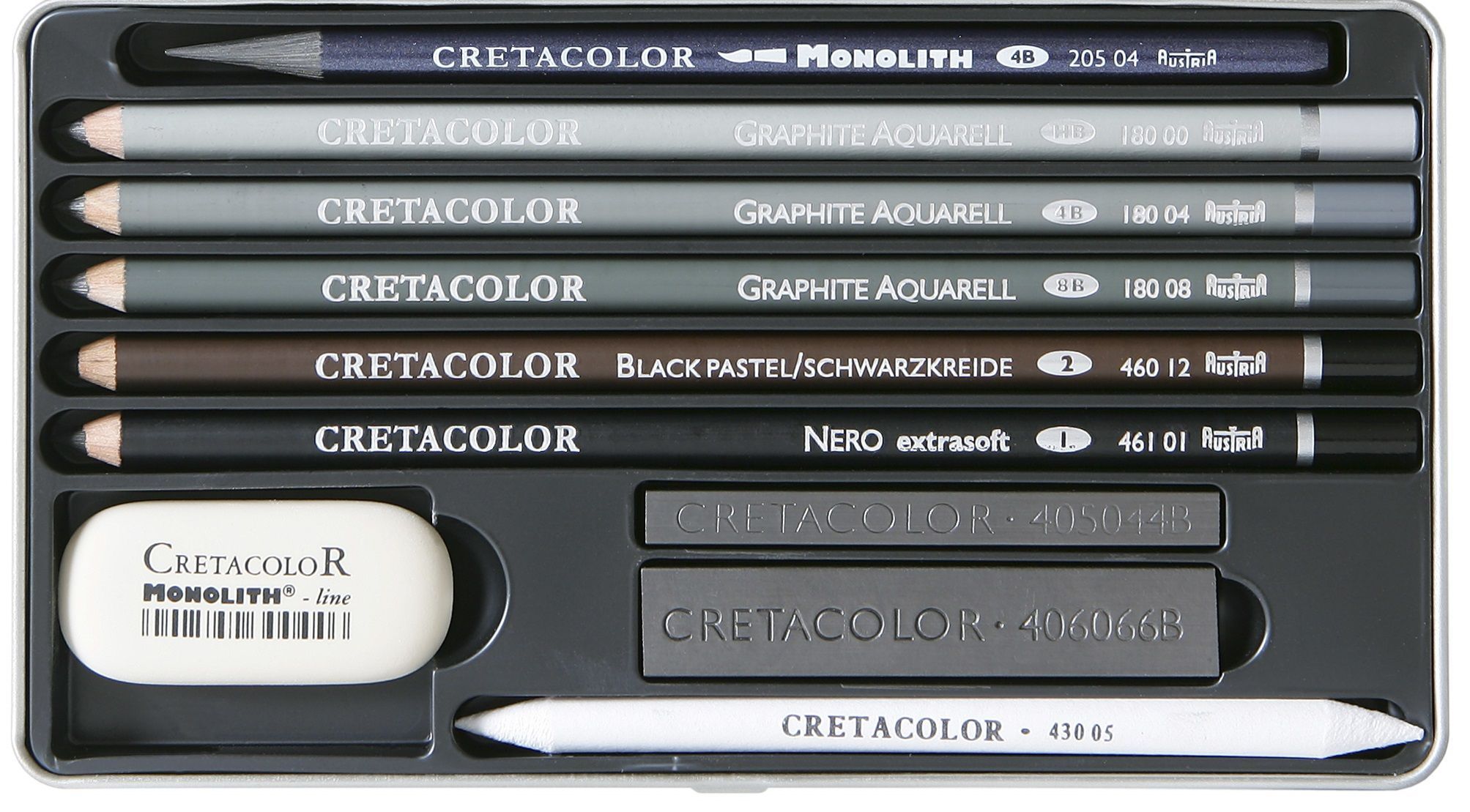 В этот набор входит ряд графитовых материалов для рисования, а также угольный карандаш и карандаш Nero для глубоких черных линий. Четыре водорастворимых графитовых карандаша делают этот набор идеальным для экспериментальных техник и традиционных эскизов.