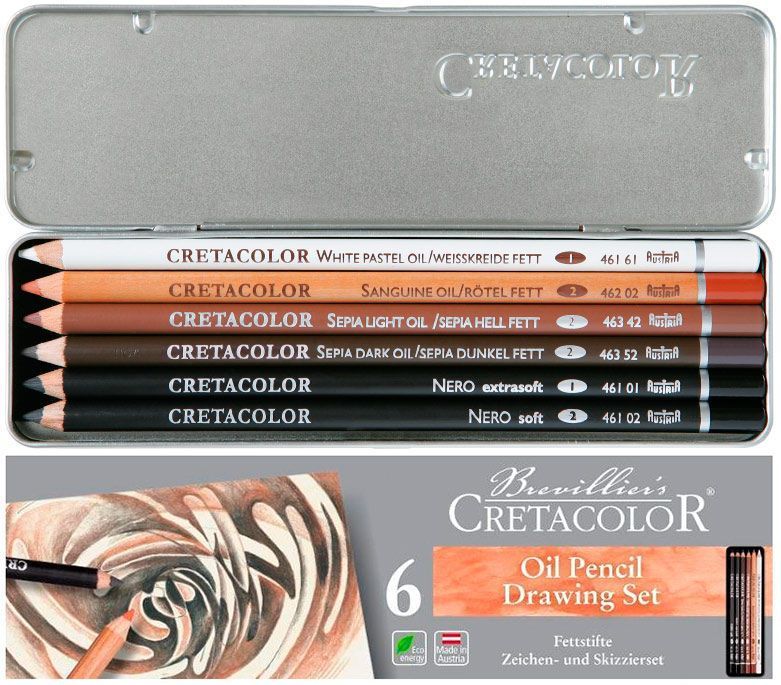 Подобранный специалистами набор масляных карандашей для эскизов и рисования. Позволяет сочетать удобство формы карандаша и все преимущества традиционных материалов. Масляные карандаши дают яркий блестящий штрих, водостойкие, работа не требует закрепления. Сангина, сепия светлая и тёмная, два угольных карандаша «Nero» и белый мел – предусмотрено всё, чтобы получился отличный набор для рисования, подарок для любого художника.