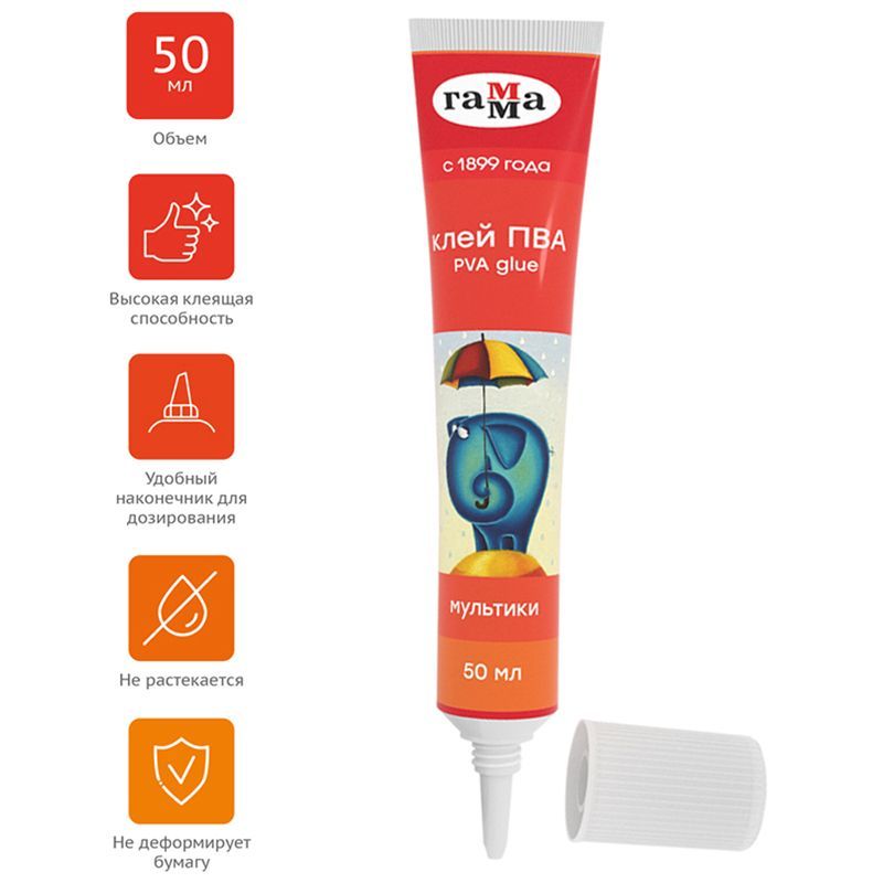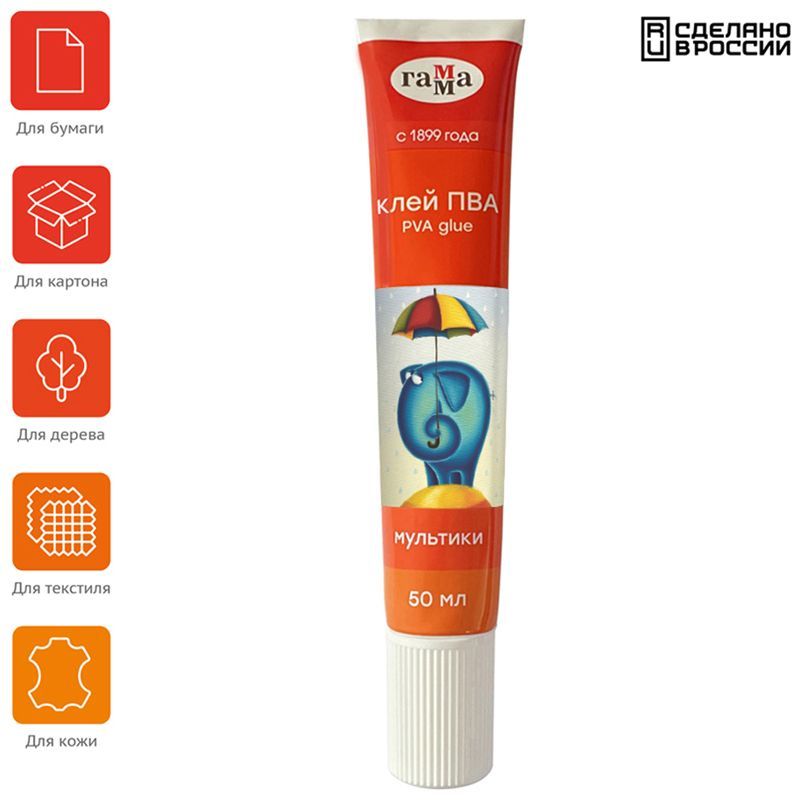 Клей ПВА "Мультики" легко наносится и отлично склеивает бумагу, картон, дерево, текстиль и кожу и не растекается в процессе использования, а бумага после склеивания не деформируется.