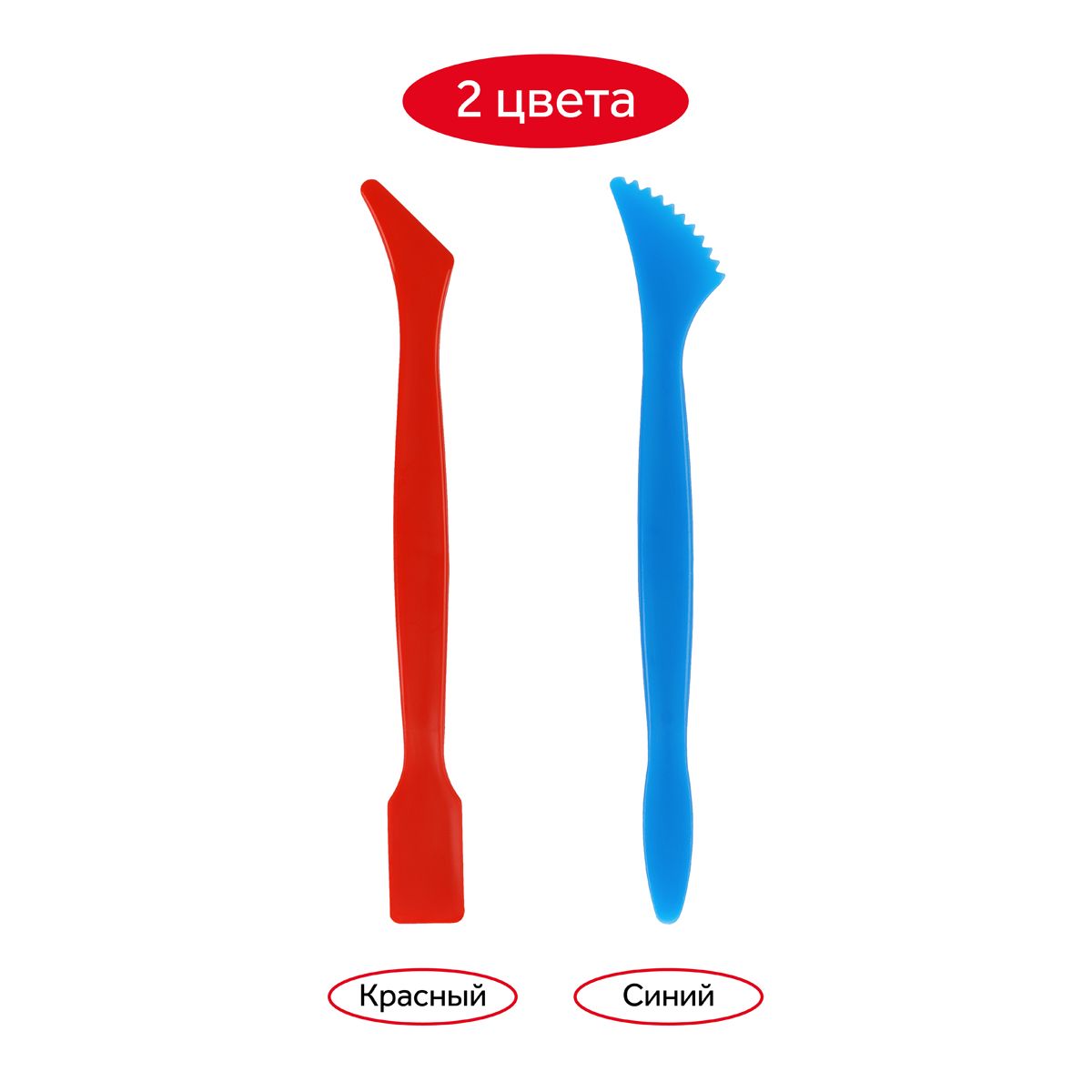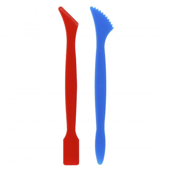 В наборе 2 цветных стека из полистирола – синий и красный. Каждый стек имеет 2 рабочих конца разной формы и предназначения. Стеки подходят для более точной проработки мелких деталей, которые сложно сделать пальцами, а также для придания фактуры изделию. Рекомендуются для использования при работе с пластилином, полимерной и любой другой глиной, а также с гипсом и прочими пластичными массами.