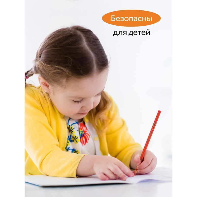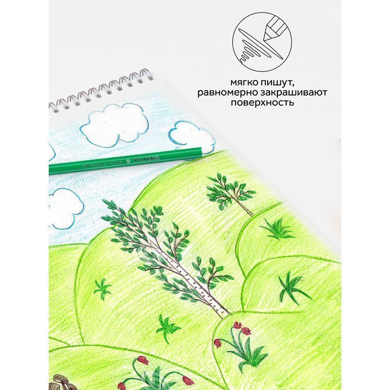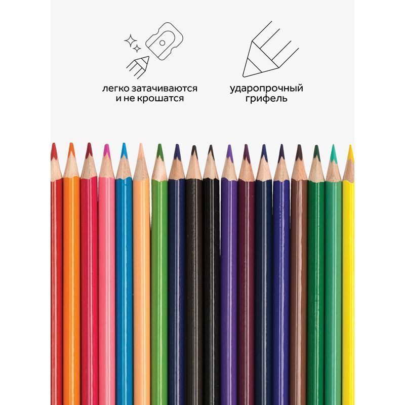 В наборе: 6 классических, 6 неоновых и 6 пастельных цветов. «Волшебные» цвета дают возможность проявить фантазию и создать любой сказочный сюжет. Шестигранный корпус из мягкой натуральной древесины легко точить. Проклеенный ударопрочный грифель не крошится во время рисования и не ломается даже после падения. За яркость и высокую укрывистость отвечают качественные пигменты в составе. Ребенку не придется сильно давить на карандаш — рисунок получится ярким и равномерно закрашенным.