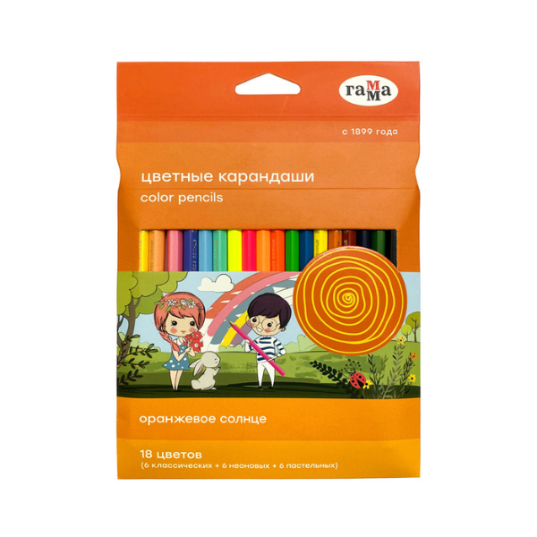Цветные карандаши серии "Оранжевое солнце" в удобной упаковке-конверте имеют расширенную палитру цветов, включающую классические цвета и цвета с различными эффектами.