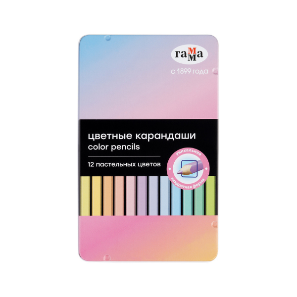 Цветные карандаши ГАММА выполнены в уникальной квадратной форме. В наборе 12 пастельных цветов. Диаметр грифеля — 2,9 мм.