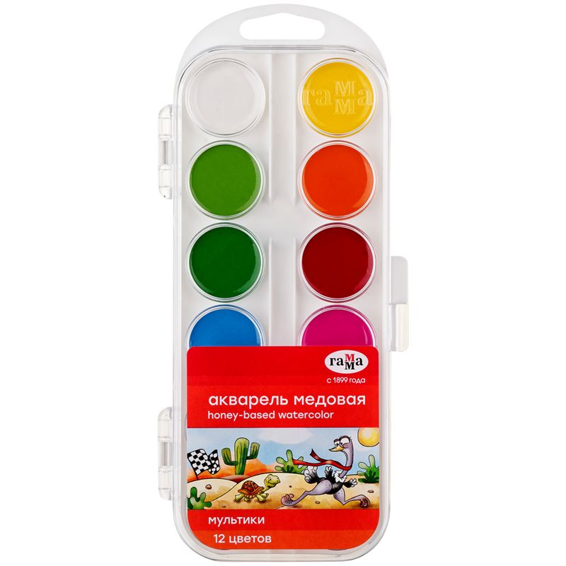 Медовая акварель серии "Мультики" разработана с учетом рекомендаций педагогов. Идеально подходит для занятий рисованием в детском саду, школе и дома. Яркие чистые цвета развивают фантазию и интерес к творчеству. Акварель безопасна для детей. Удобный пластиковый пенал, крышка плотно фиксируется и служит палитрой для смешивания красок. Кюветы с высокими бортиками и увеличенным расстоянием между красками предназначены для удобства в работе детей. Акварель легко смывается с рук и отстирывается с одежды.