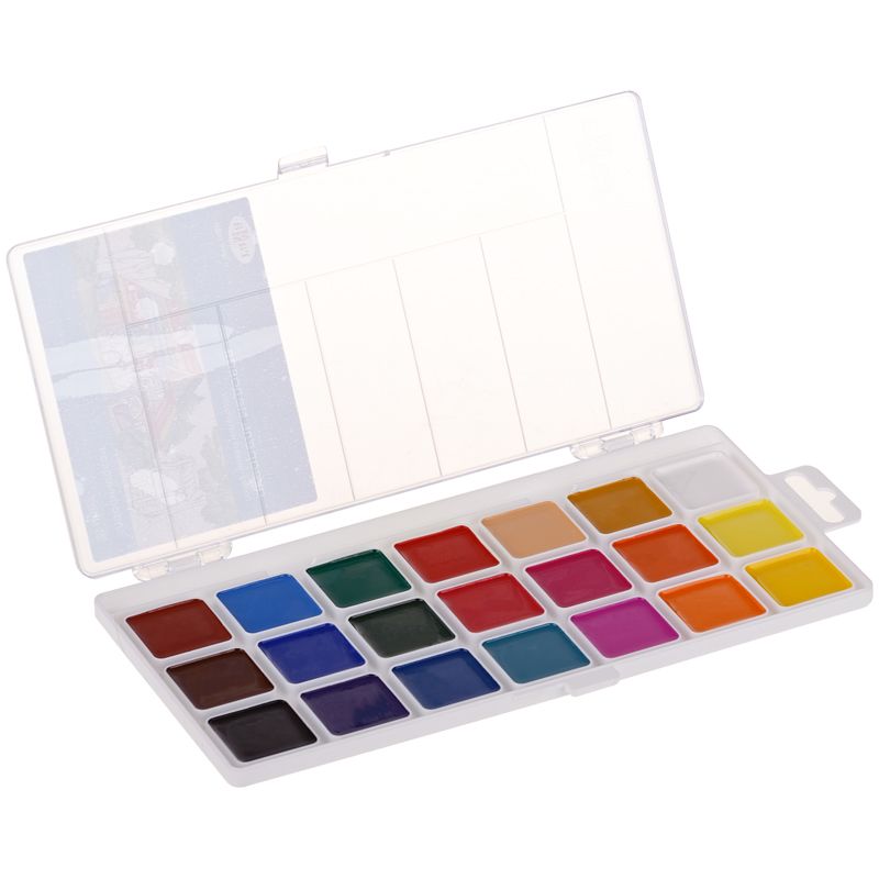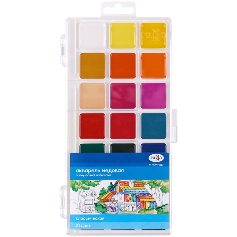 Медовая полусухая акварель ГАММА серии «Классическая» разработана для творческих занятий в школе и дома. Естественные цвета акварели обучают правильному цветовосприятию окружающего мира. Краски изготовлены на основе органических пигментов и натурального связующего. Прозрачность красок, яркость и чистота цвета, разносимость и размываемость — основные характеристики акварели серии «Классическая». Удобный пластиковый пенал: палитра для смешивания красок расположена на крышке, а кюветы с высокими бортиками и увеличенное расстояние между красками не позволяют цветам смешиваться в подложке во время рисования. Акварель легко смывается с рук и отстирывается с одежды.