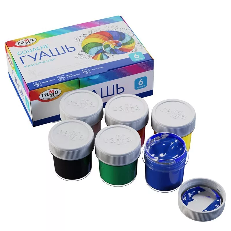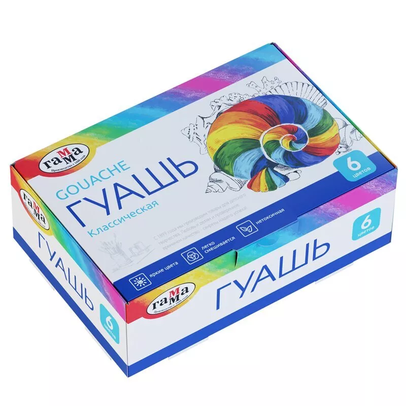 Гуашь серии «Классическая» предназначена для творческих занятий с детьми в школе и дома. Краска производится на основе качественного прозрачного связующего вещества, которое обеспечивает чистоту цветов. Краски плотные, укрывистые, хорошо смешиваются, равномерно наносятся практически на любую основу. При высыхании создают плотный красочный слой с бархатистым эффектом. Цветовая палитра гуаши данной серии состоит из 6 классических оттенков краски (белый, чёрный, алый, ультрамарин, зелёный, жёлтый). Гуашь фасуется в пластиковые герметичные баночки с логотипом на крышке. Объём одной баночки — 20 мл. Общий объём — 120 мл.