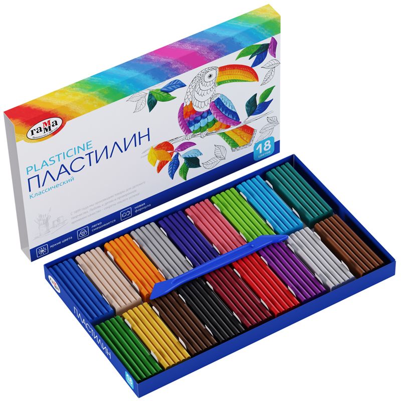 Пластилин ГАММА серии «Классическая» — это 18 брусков ярких насыщенных цветов. Пластиковый стек в комплекте. Вес одного бруска — 20 г. Пластилин разработан для детей от 7 до 12 лет. Благодаря улучшенной формуле становится эластичным при разминании, не рвётся на фракции, хорошо держит форму и позволяет лепить тончайшие детали. Прекрасно подходит для создания картин в технике пластилинографии. Не пачкает руки и рабочую поверхность.