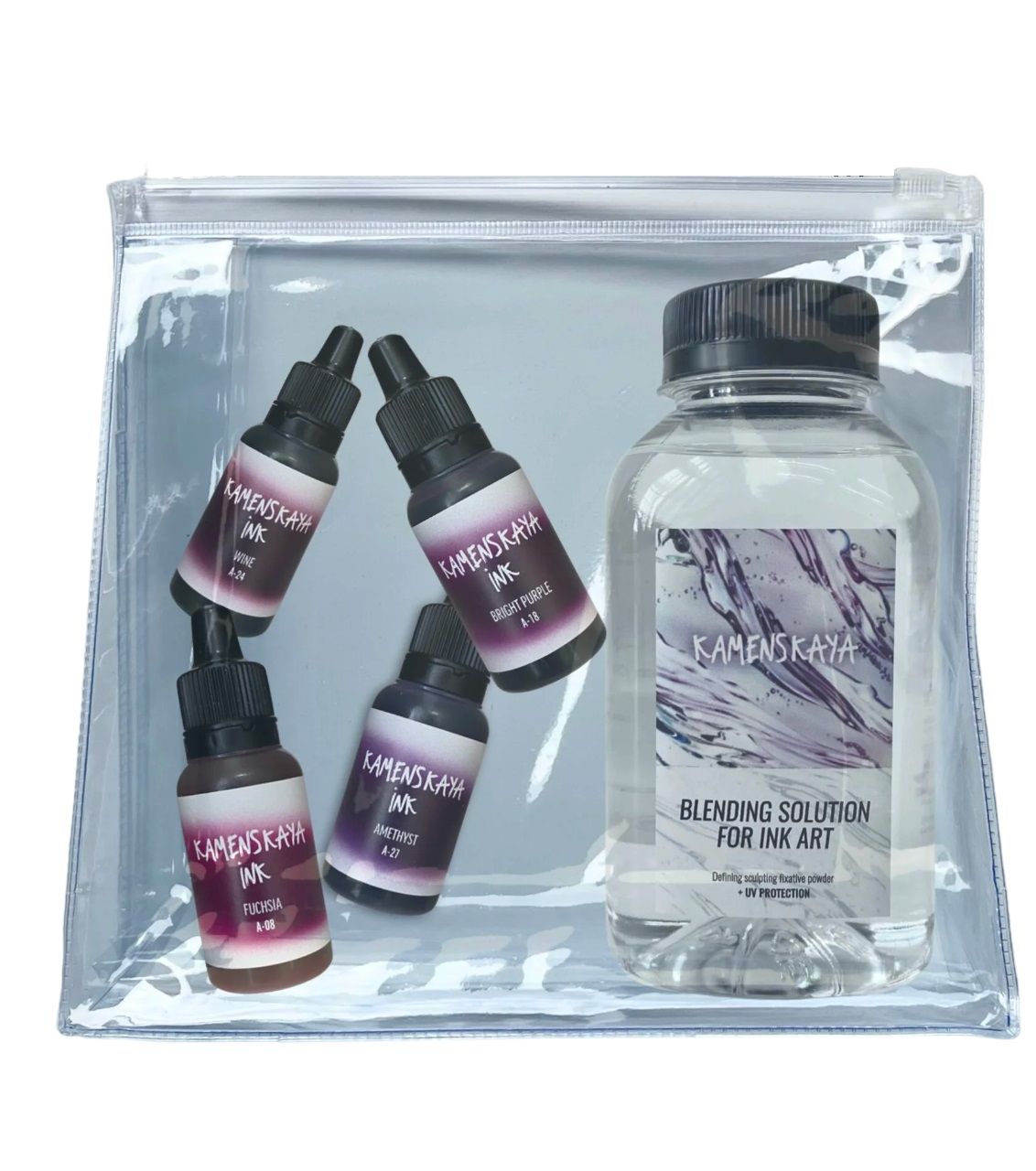 Авторское цветовые комбинации от Полины Каменской. Наборы содержат комбинации чернил из разных категорий. Краски прекрасно смешиваются, дополняя друг друга, прекрасно ложатся на синтетические гладкие поверхности и быстро сохнут. Чернила очень концентрированные и перед использованием должны быть разбавлены раствора для смешивания.