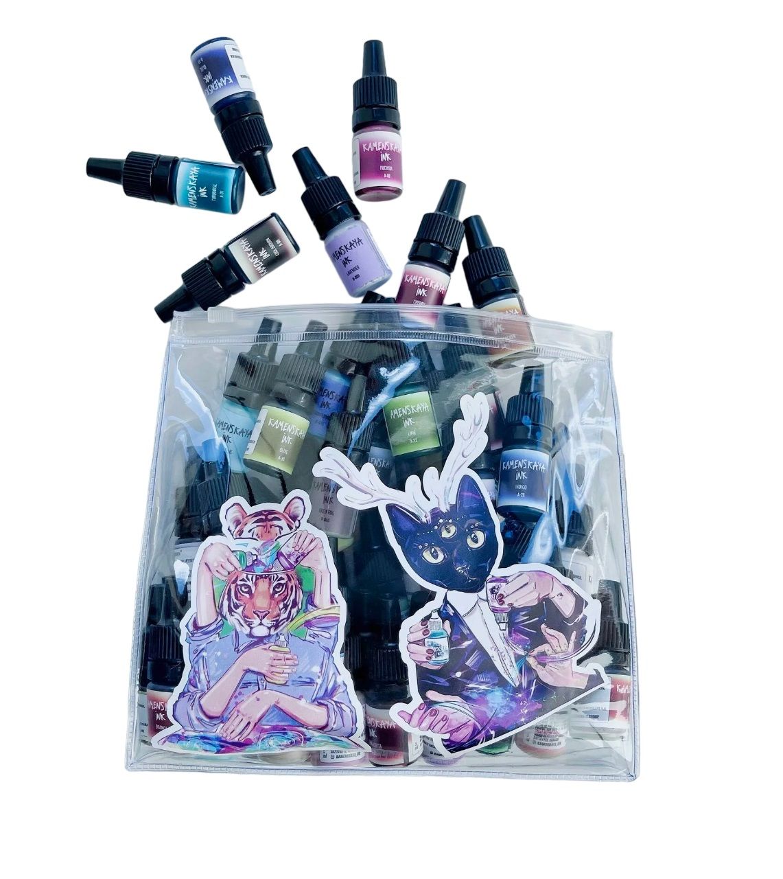 В наборе 50 красок по 5 мл: 34 краски базовой линии А (на краске, роскошные полупрозрачные концентрированные оттенки) и 16 красок линии «Nude» (пигментные краски нежных пастельных оттенков).