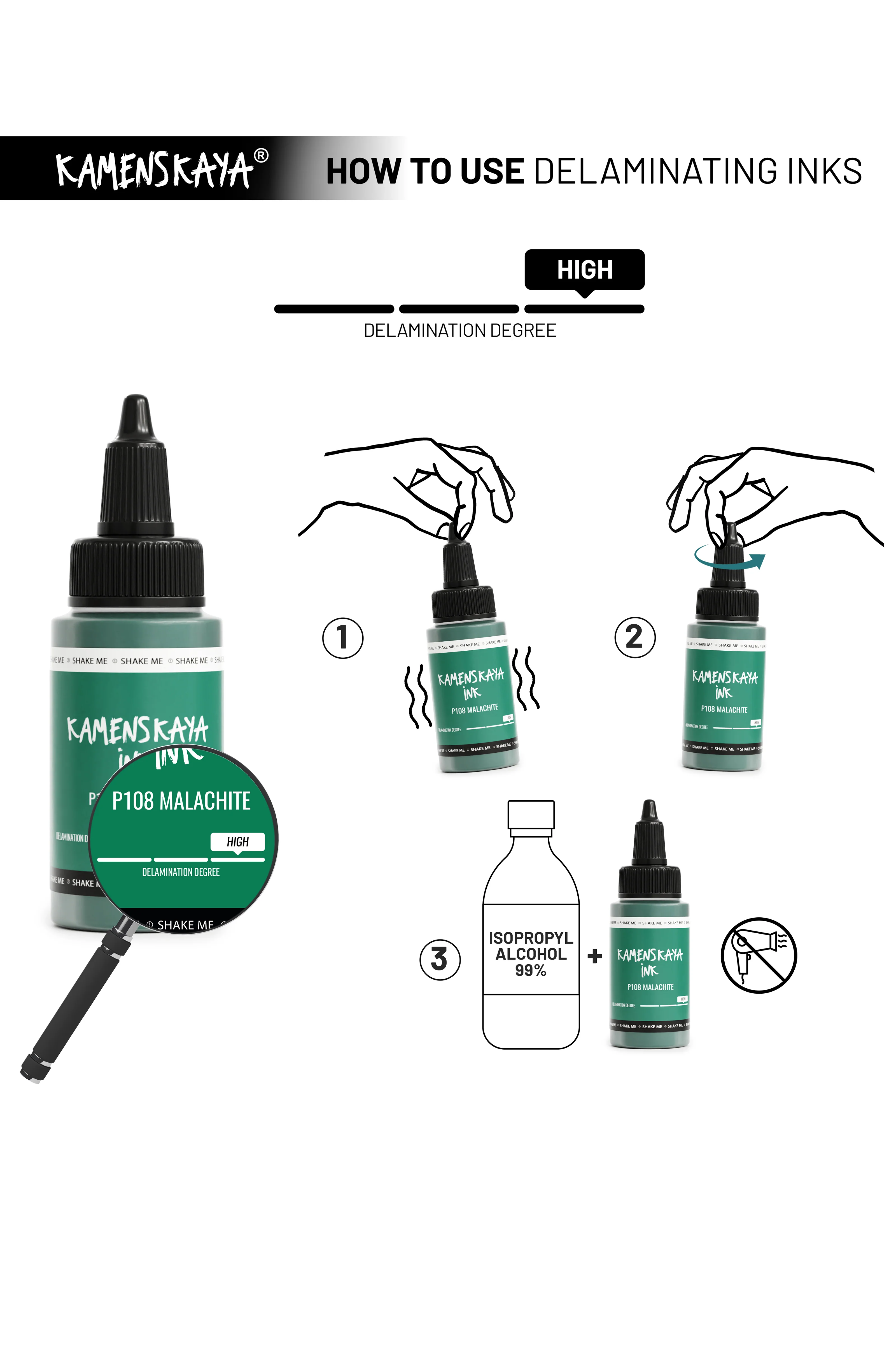Способ 2: Налить чернила на поверхность и высушить их феном, как если бы вы делали это с обычными спиртовыми чернилами. Для усиления первоначального эффекта расслаивания (который может быть высоким, средним или низким, как показано на полосе на наклейке продукта) вам потребуется добавить воду к спирту (70% должно быть спиртом и 30% - водой). Эффект расслоения происходит только на разбавителе Kamenskaya или при использовании этилового спирта. На изопропиловом спирте большинство чернил не расслаиваются (исключение – чернила с высокой степенью расслоения).