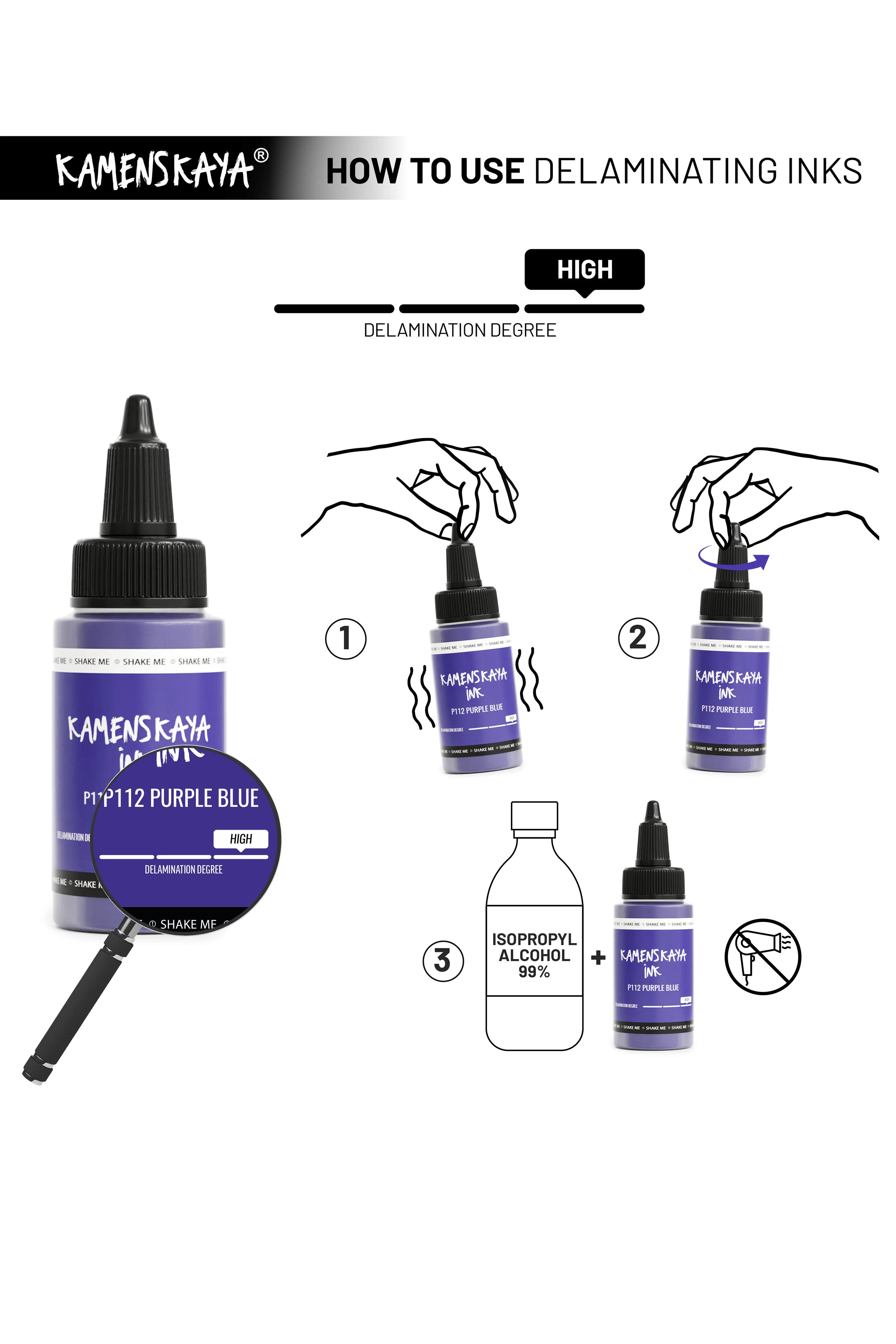 Способ 2: Налить чернила на поверхность и высушить их феном, как если бы вы делали это с обычными спиртовыми чернилами. Для усиления первоначального эффекта расслаивания (который может быть высоким, средним или низким, как показано на полосе на наклейке продукта) вам потребуется добавить воду к спирту (70% должно быть спиртом и 30% - водой). Эффект расслоения происходит только на разбавителе Kamenskaya или при использовании этилового спирта. На изопропиловом спирте большинство чернил не расслаиваются (исключение – чернила с высокой степенью расслоения).