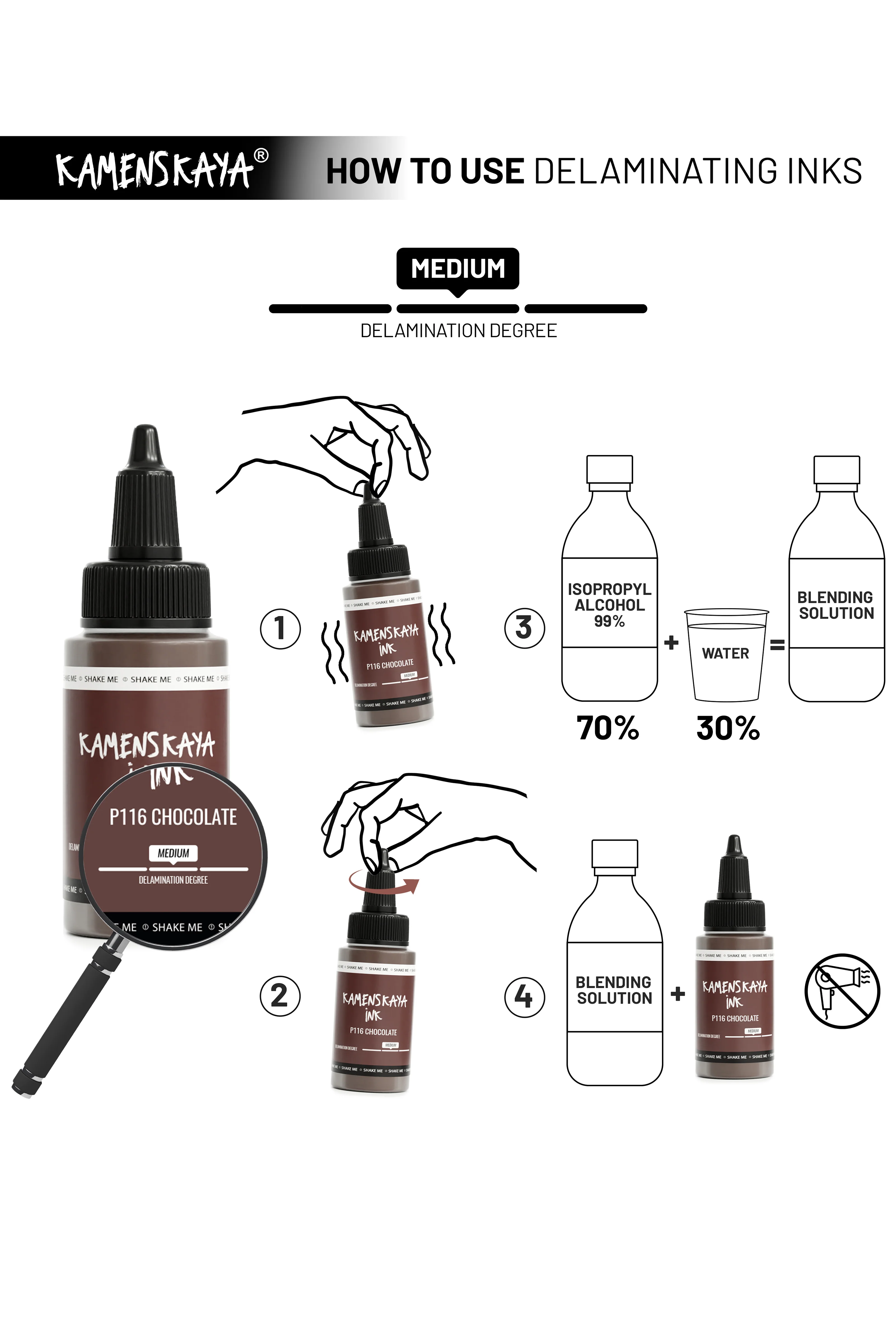 Способ 2: Налить чернила на поверхность и высушить их феном, как если бы вы делали это с обычными спиртовыми чернилами. Для усиления первоначального эффекта расслаивания (который может быть высоким, средним или низким, как показано на полосе на наклейке продукта) вам потребуется добавить воду к спирту (70% должно быть спиртом и 30% - водой). Эффект расслоения происходит только на разбавителе Kamenskaya или при использовании этилового спирта. На изопропиловом спирте большинство чернил не расслаиваются (исключение – чернила с высокой степенью расслоения).