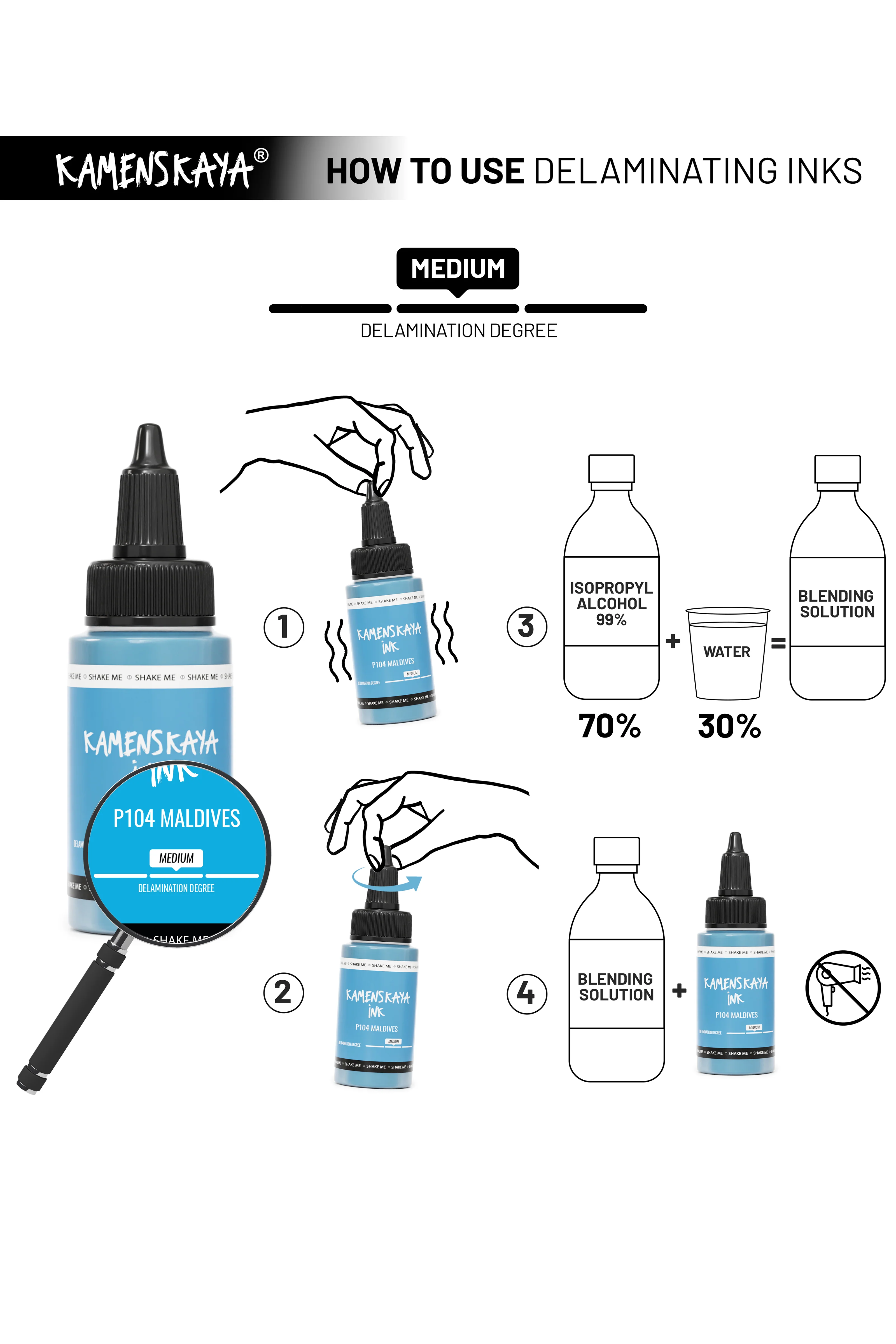 Способ 2: Налить чернила на поверхность и высушить их феном, как если бы вы делали это с обычными спиртовыми чернилами. Для усиления первоначального эффекта расслаивания (который может быть высоким, средним или низким, как показано на полосе на наклейке продукта) вам потребуется добавить воду к спирту (70% должно быть спиртом и 30% - водой). Эффект расслоения происходит только на разбавителе Kamenskaya или при использовании этилового спирта. На изопропиловом спирте большинство чернил не расслаиваются (исключение – чернила с высокой степенью расслоения).