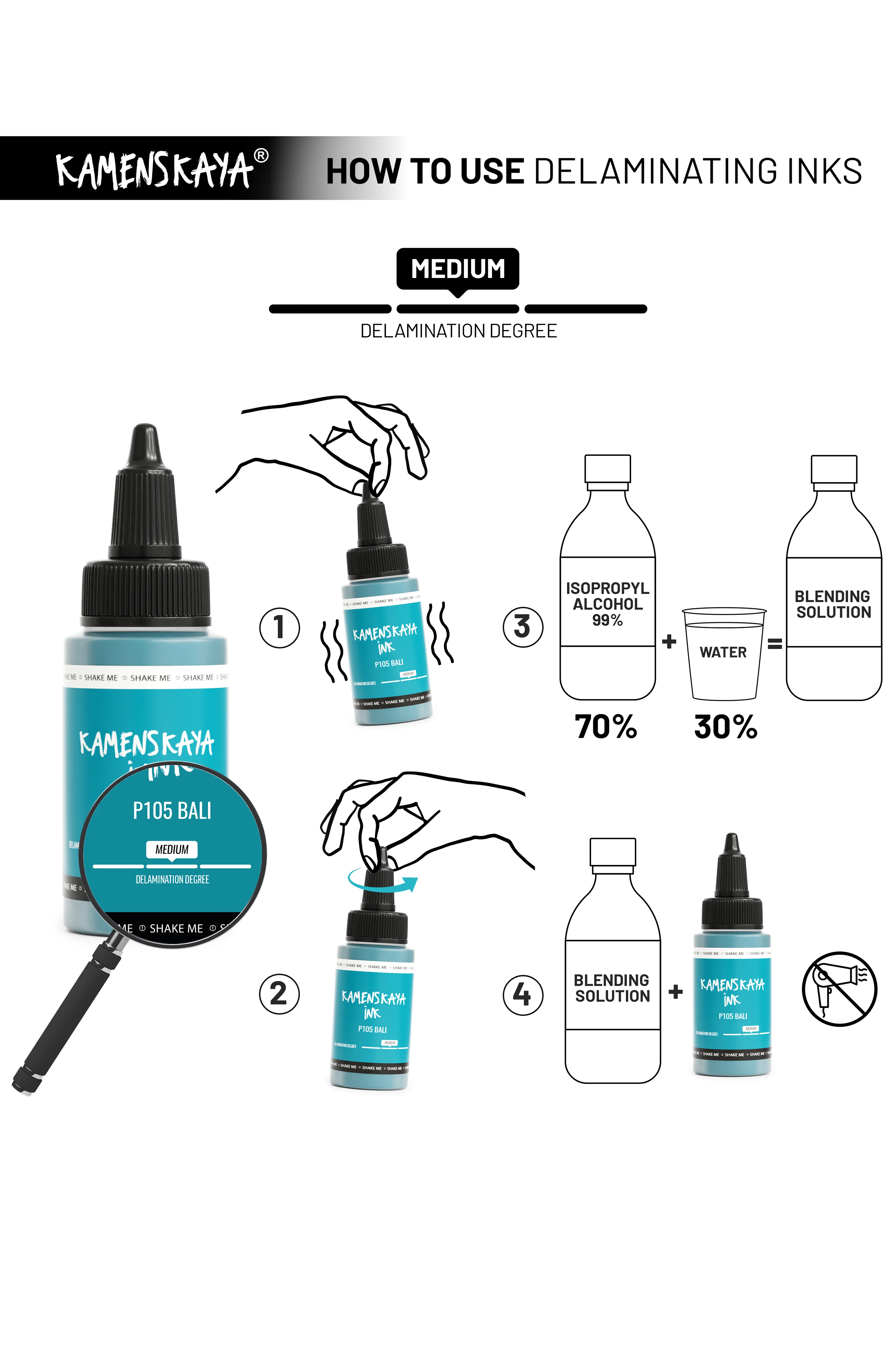 Способ 2: Налить чернила на поверхность и высушить их феном, как если бы вы делали это с обычными спиртовыми чернилами. Для усиления первоначального эффекта расслаивания (который может быть высоким, средним или низким, как показано на полосе на наклейке продукта) вам потребуется добавить воду к спирту (70% должно быть спиртом и 30% - водой). Эффект расслоения происходит только на разбавителе Kamenskaya или при использовании этилового спирта. На изопропиловом спирте большинство чернил не расслаиваются (исключение – чернила с высокой степенью расслоения).