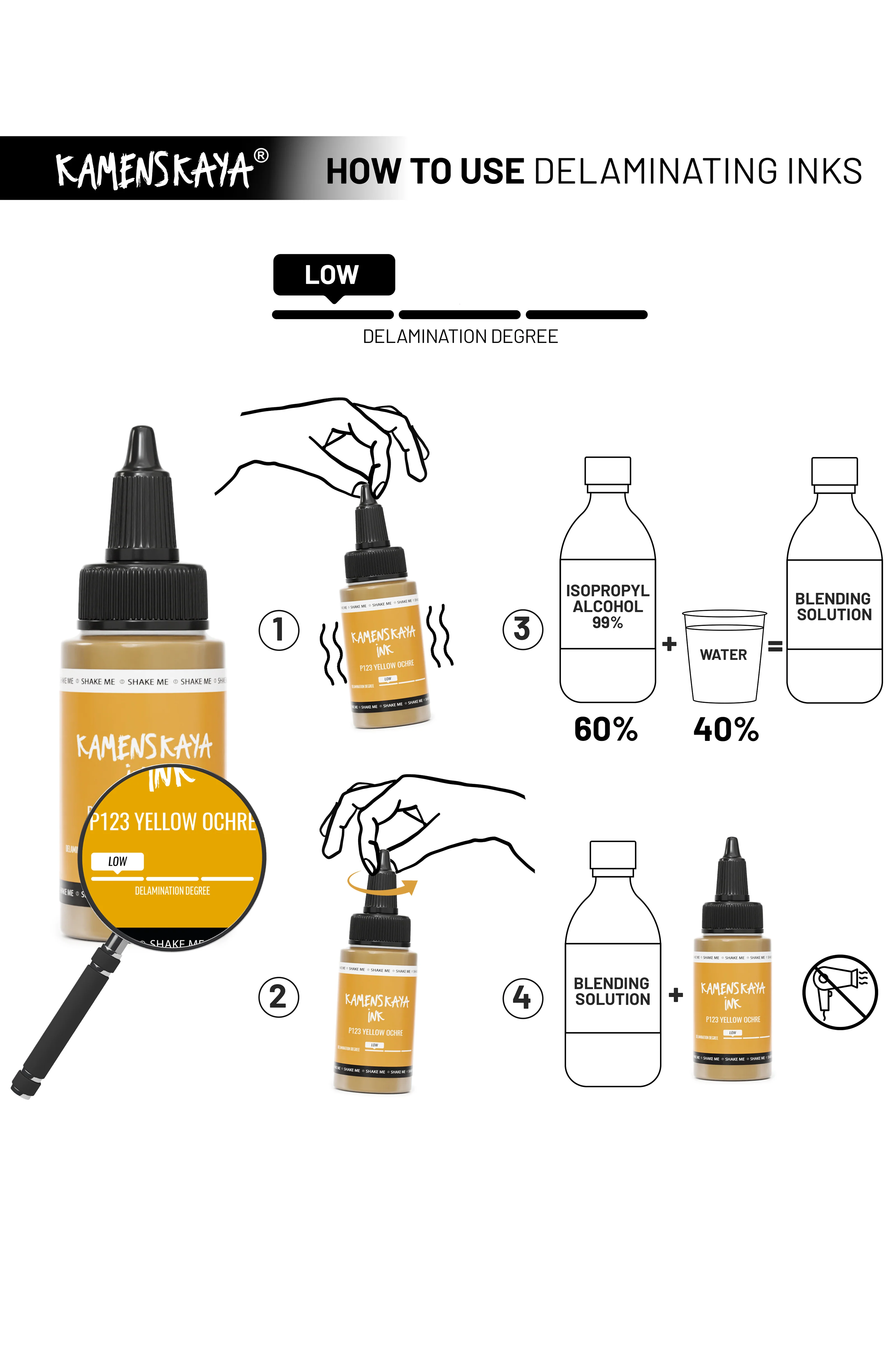 Способ 2: Налить чернила на поверхность и высушить их феном, как если бы вы делали это с обычными спиртовыми чернилами. Для усиления первоначального эффекта расслаивания (который может быть высоким, средним или низким, как показано на полосе на наклейке продукта) вам потребуется добавить воду к спирту (70% должно быть спиртом и 30% - водой). Эффект расслоения происходит только на разбавителе Kamenskaya или при использовании этилового спирта. На изопропиловом спирте большинство чернил не расслаиваются (исключение – чернила с высокой степенью расслоения).
