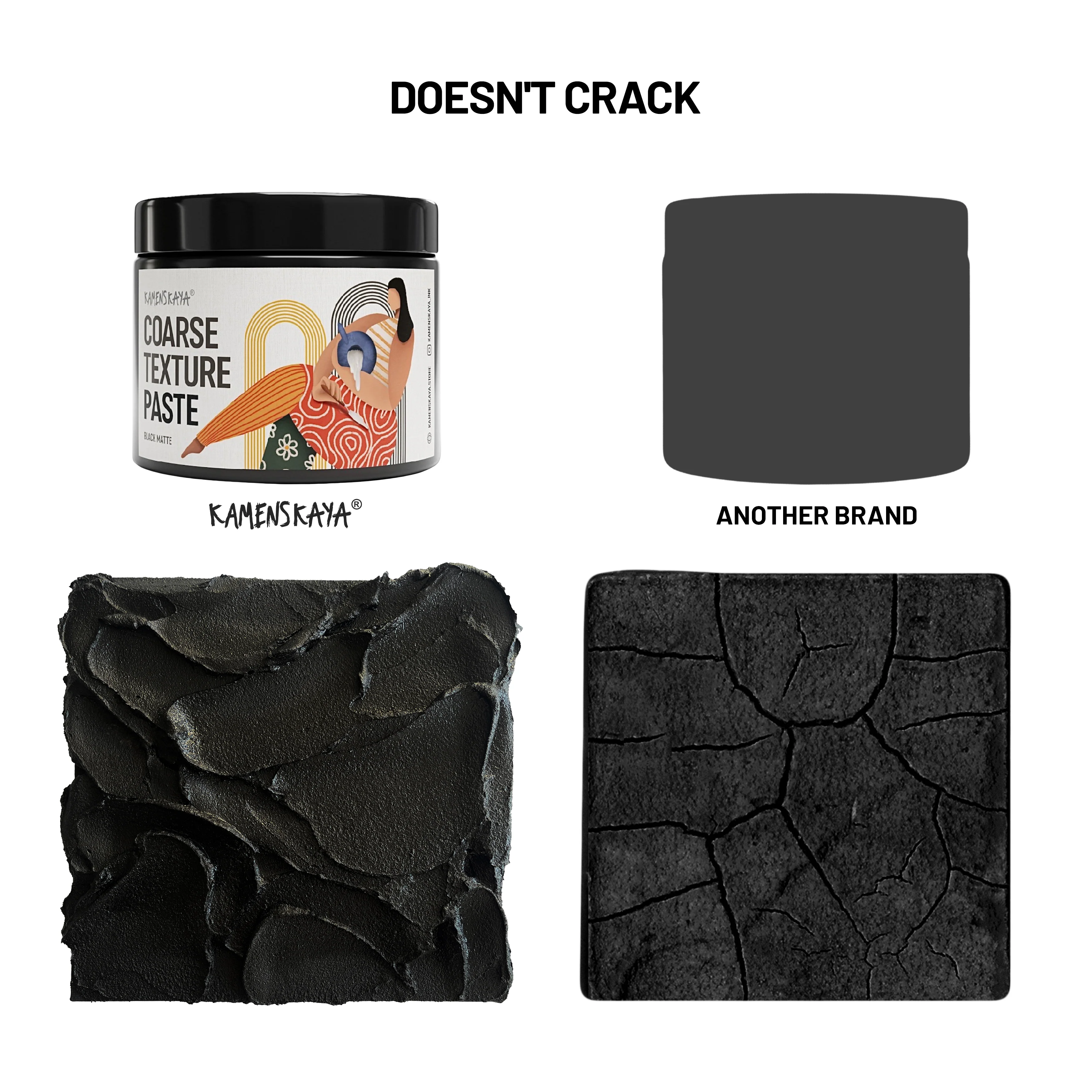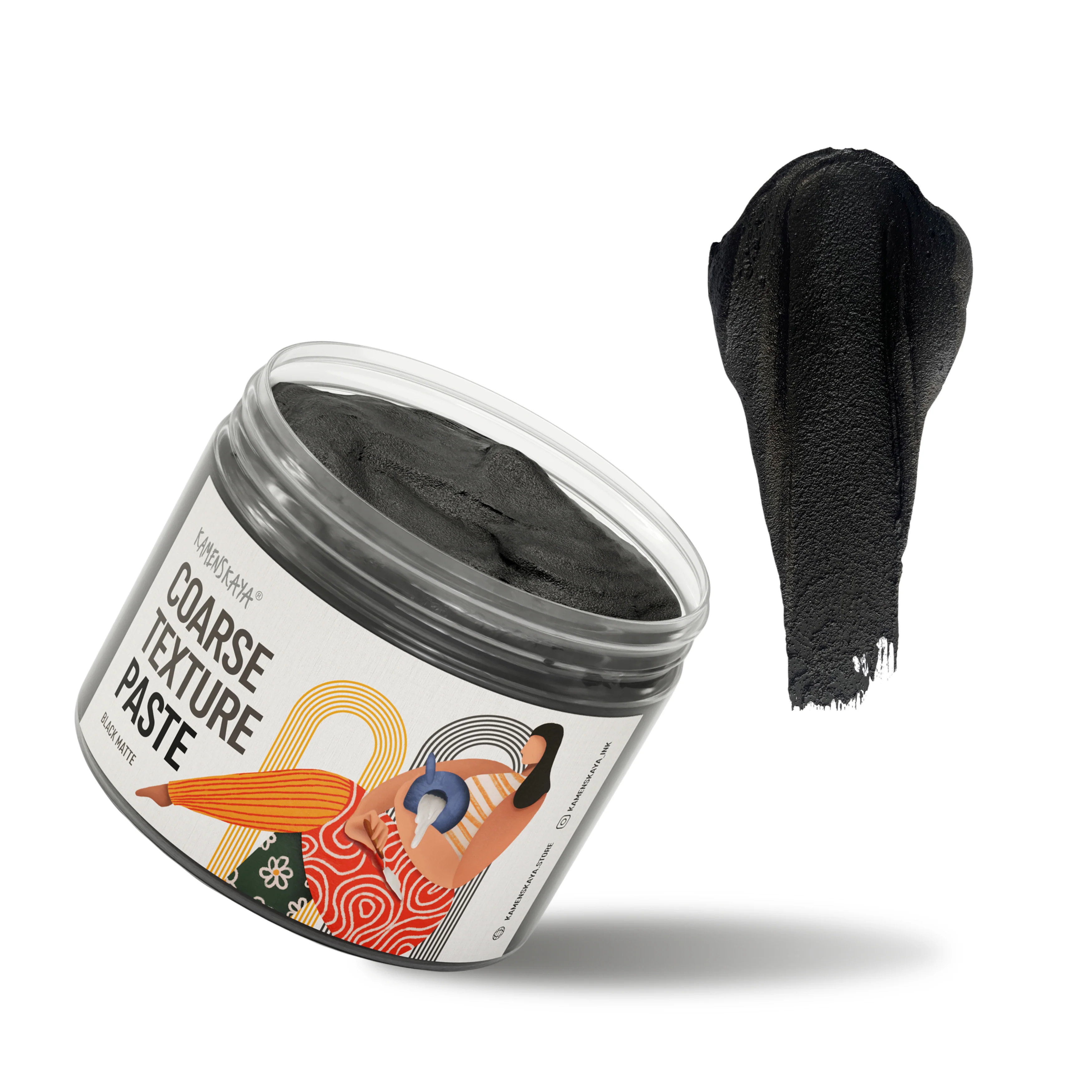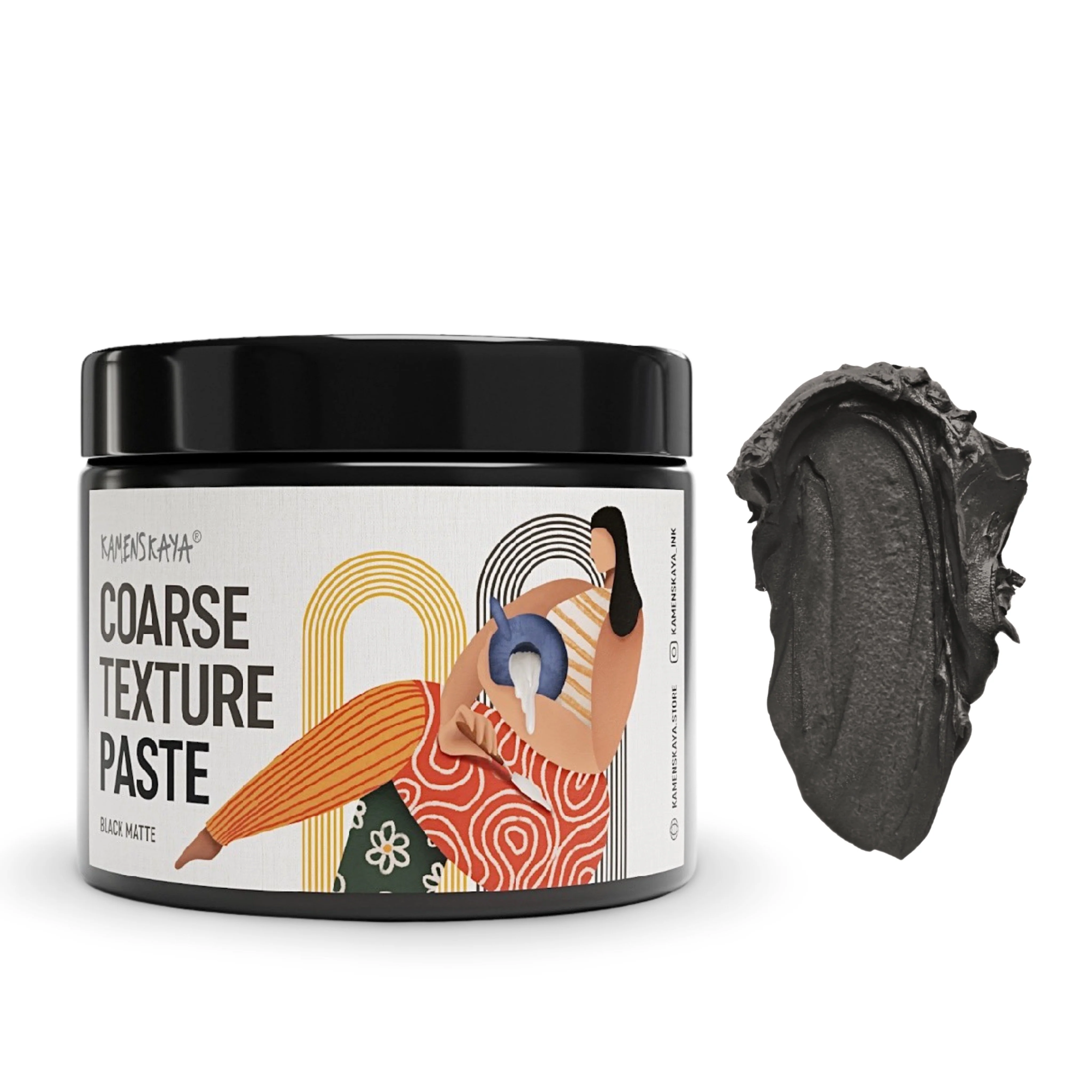 Черная паста для грубой текстуры. Моделирующая паста с мелкими частицами кварцевого песка с матовым финишем. Густая консистенция, хорошо держит форму, пластична. После высыхания не трескается, можно создавать фактуру высотой до 2 сантиметров. Влагостойкий, не дает усадки после высыхания.