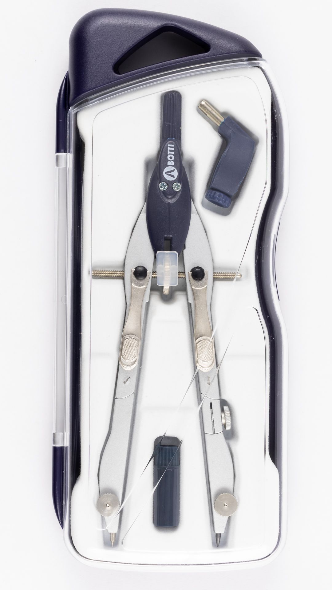 В комплект входят: циркуль из цинкового сплава 175 мм с шарнирными ножками, держатель для грифелей, держатель для карандаша. Готовальня подойдет как для школьников-старшеклассников, так и для профессионалов. Инструменты в пластиковом кейсе с прозрачной крышкой. Сделано в Италии.
