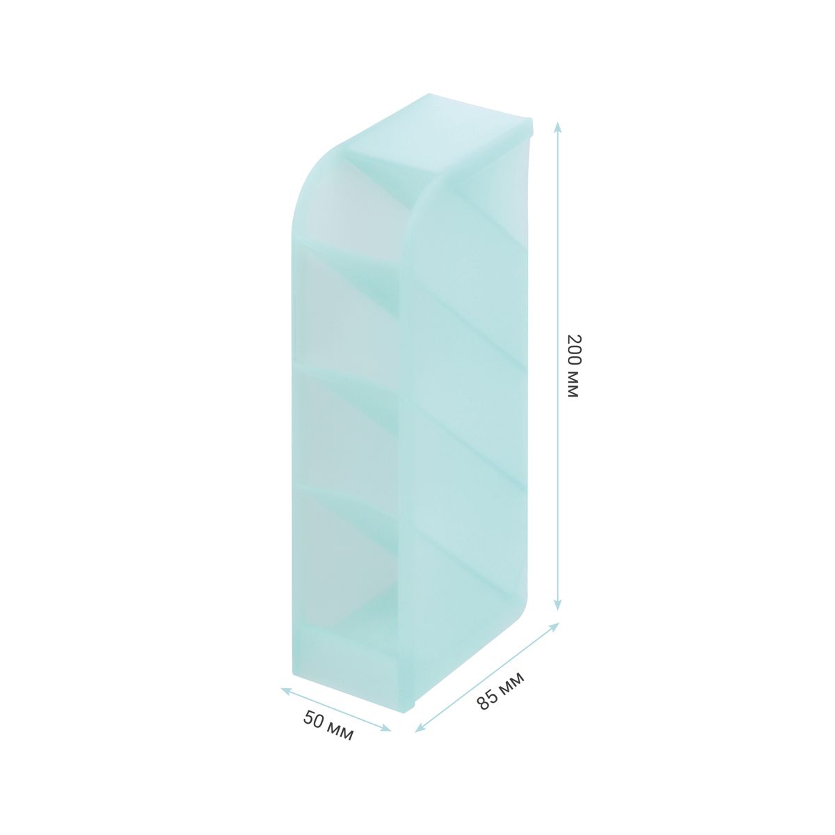 Настольная подставка MESHU на 4 секции в мятном цвете предназначена для хранения пишущих принадлежностей и канцелярских мелочей. Размер – 5*8,5*20 см. Подставка изготовлена из пластика. Её можно расположить как вертикально, так и горизонтально. Упакована в термоусадочную пленку.