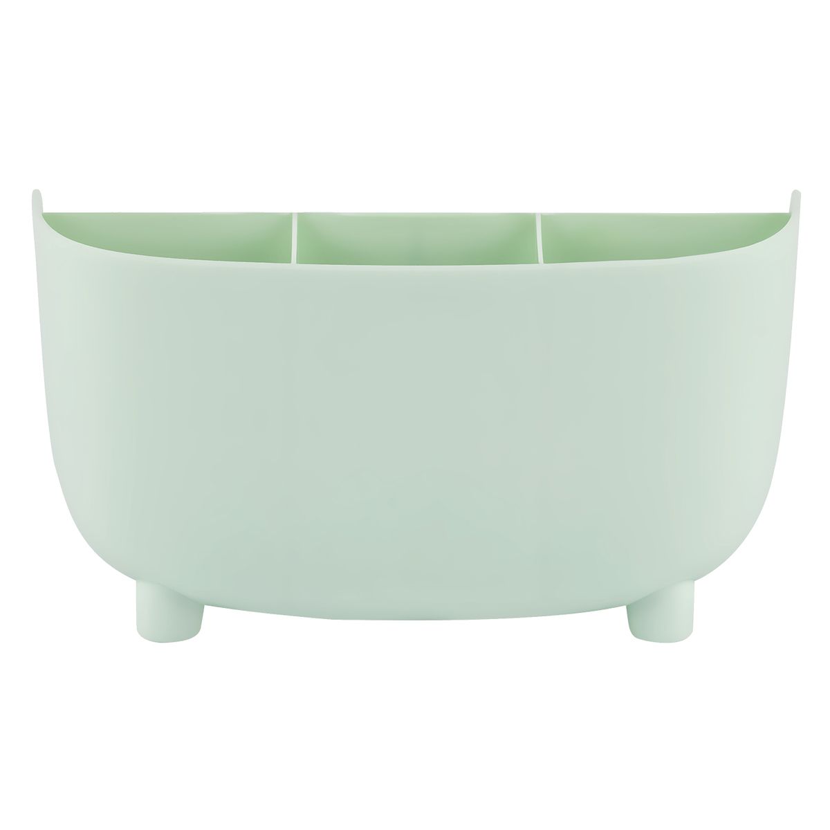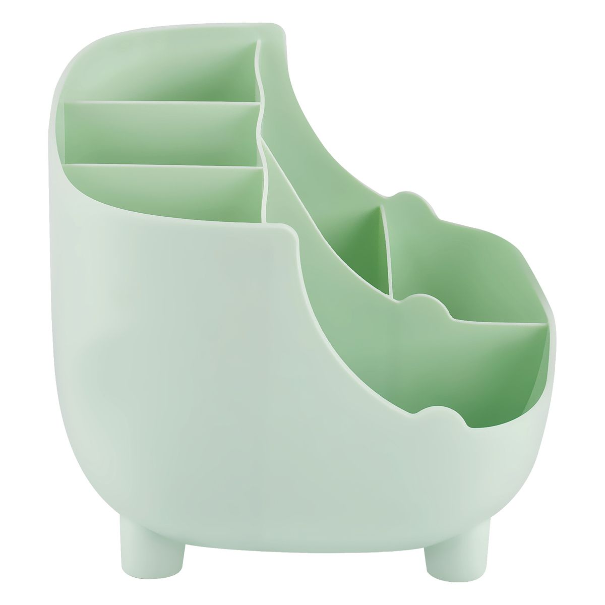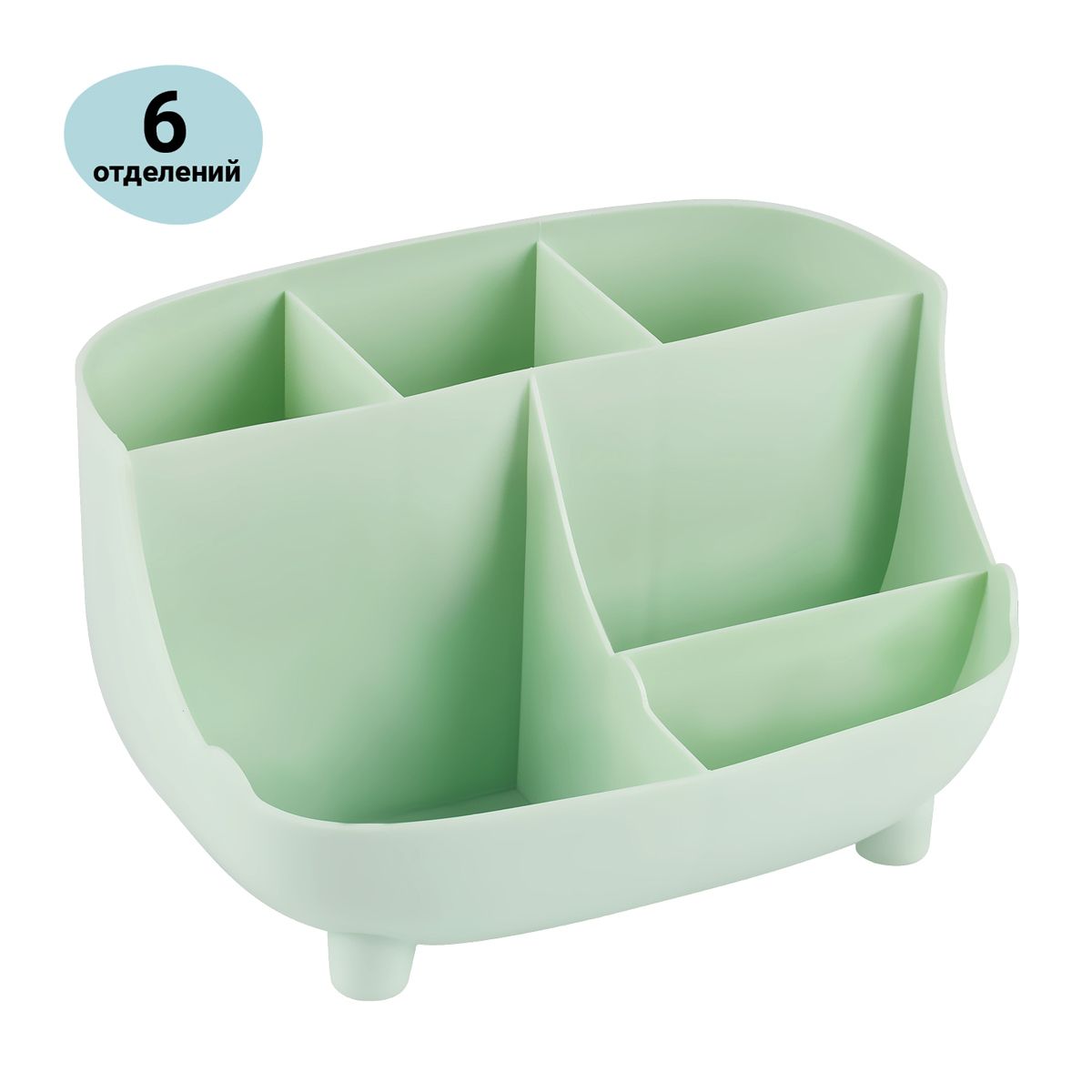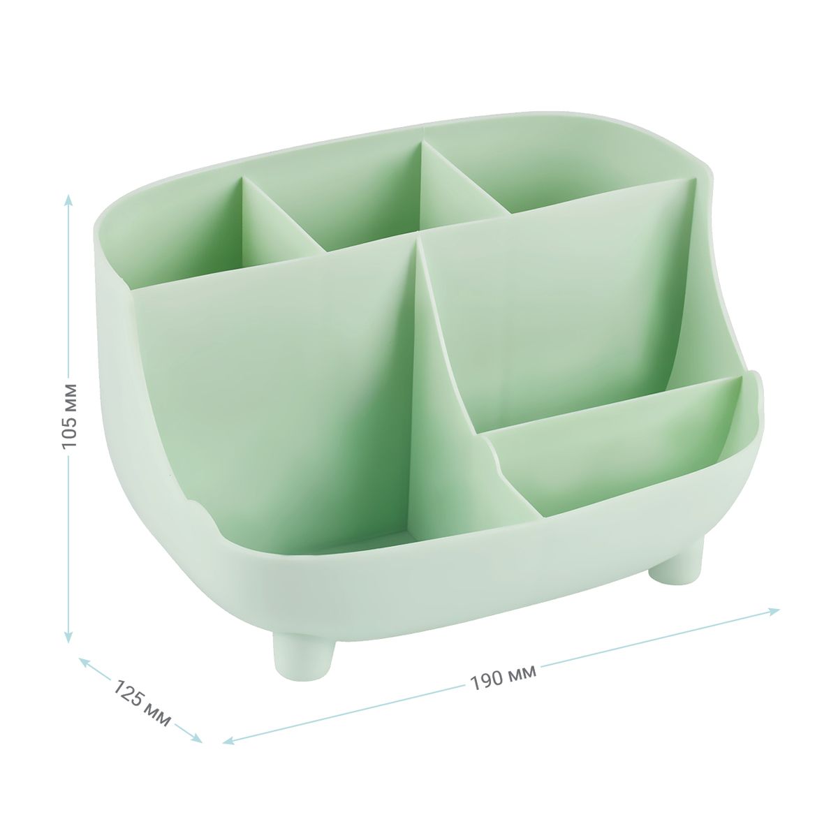 Размер – 19 x 14 x 11 см. Изделие изготовлено из пластика и имеет 6 отделений. Подставка нежного мятного цвета отлично впишется в любое рабочее пространство и станет милым предметом интерьера. Упакована в ОПП пакет с европодвесом.