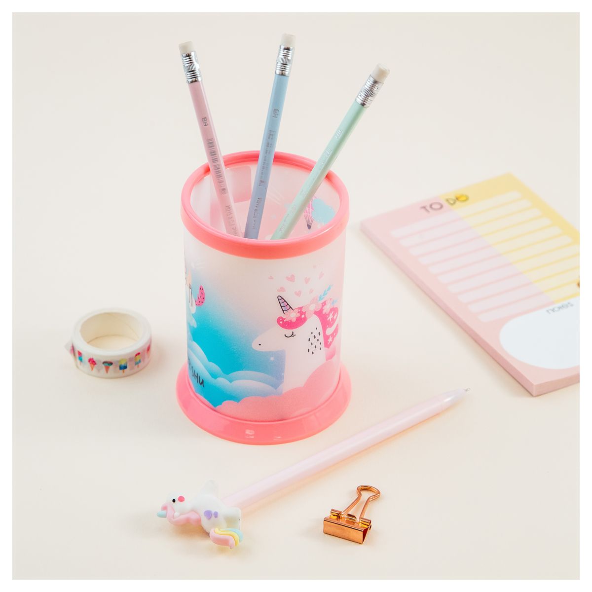 Подставка-стакан MESHU Unicorn в милом дизайне предназначена для хранения пишущих принадлежностей. Размер круглой подставки – 8.5 x 12 см. Подставка изготовлена из пластика. Упакована в ОПП пакет с европодвесом. Схема сборки подставки указана на упаковке.