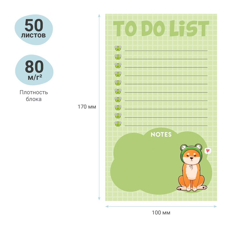 Блок бумаги для записей на склейке (To Do list) MESHU Cute dog поможет фиксировать важную информацию и интересные идеи. Плотность офсетной бумаги составляет 80 г/м2. Размер листа в блоке для заметок – 100 × 170 мм, 50 листов в упаковке.