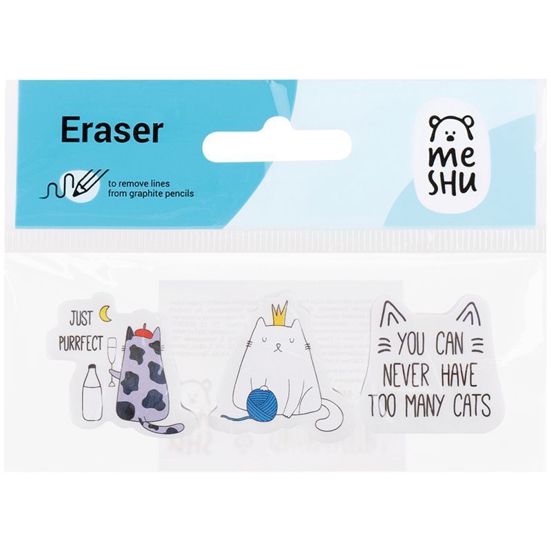 Набор ластиков MESHU Right Cat – забавный помощник в школе, офисе и дома. Ластики фигурной формы выполнены из высококачественной термопластичной резины. В наборе 3 весёлых дизайна ластика белого цвета с рисунком котиков. Размер – 40*30*13 мм. Отлично стирает чернографитный карандаш. Набор ластиков представлен в пакете с подвесом.