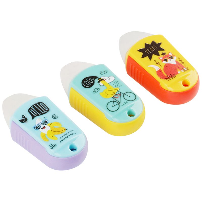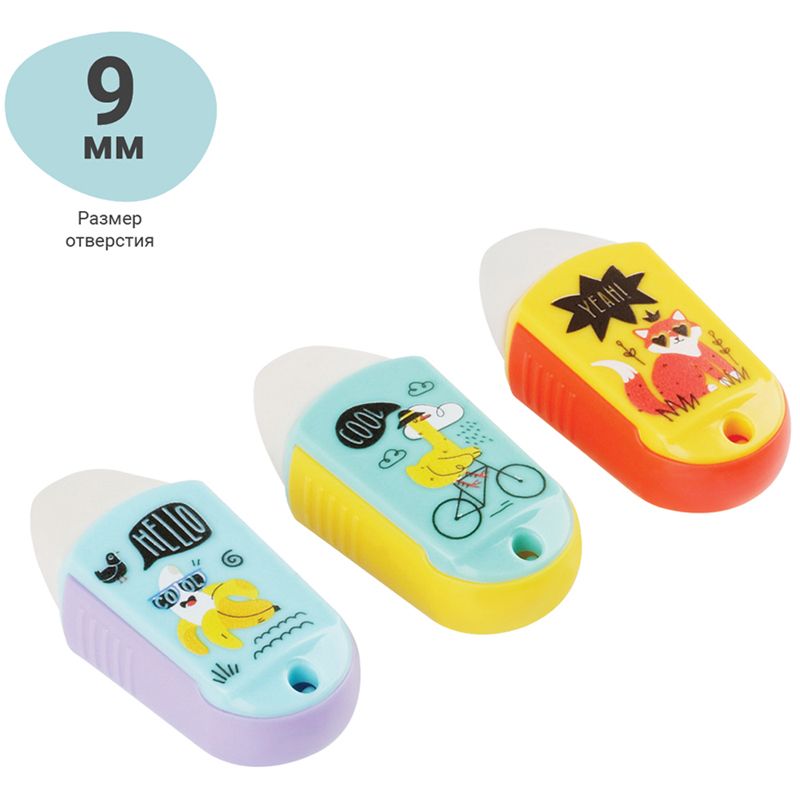 Небольшая и функциональная точилка с выдвижным механизмом имеет одно отверстие для заточки диаметром 8 мм и ластик. 3 дизайна ассорти.