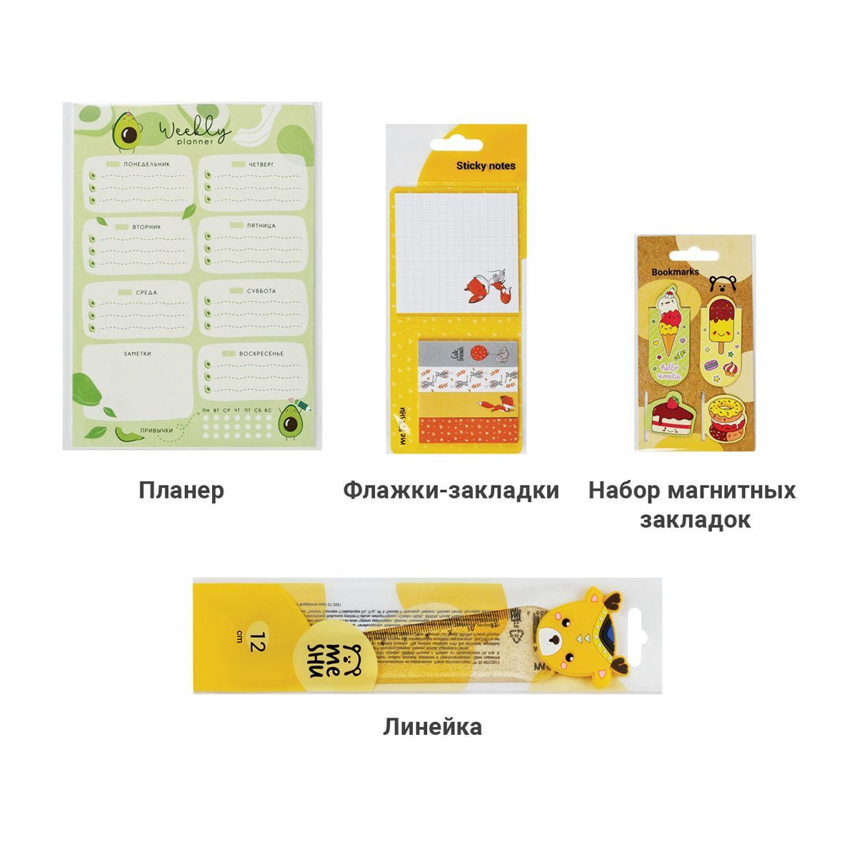наклейки 6 листов, магнитные закладки, линейка, карандаши 3 шт, тетрадь в клетку, тетрадь в линейку, планер, ручка гелевая, ручка шариковая, точилка, флажки-закладки, ластик 3 шт, декоратичный скотч 6 шт