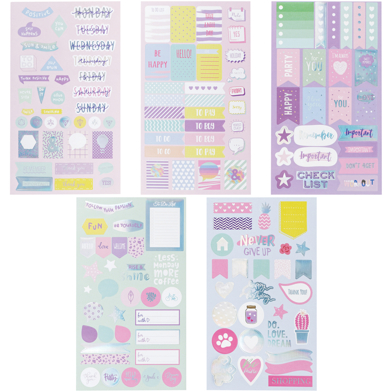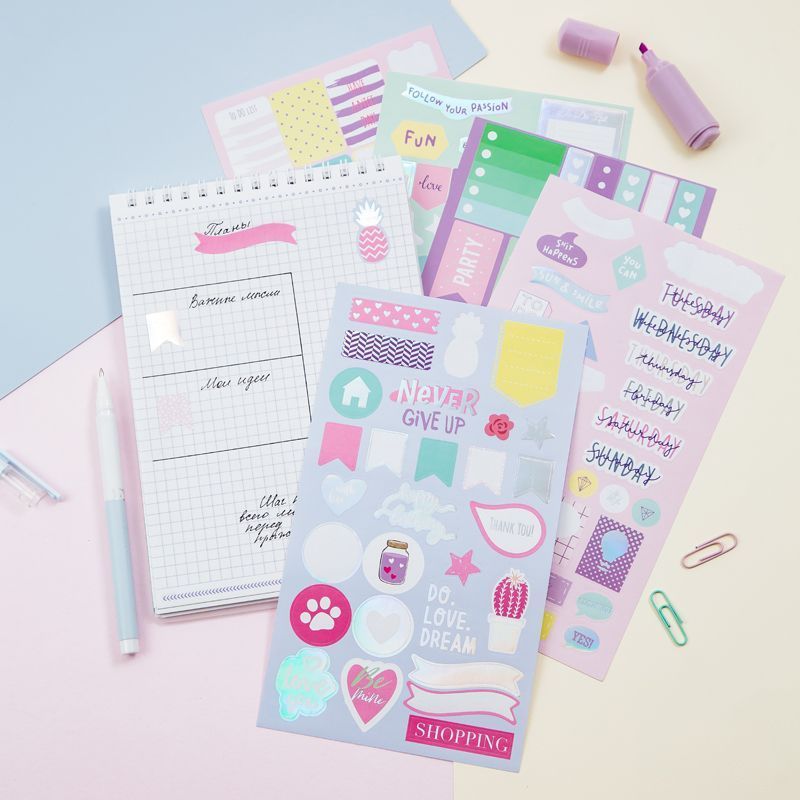 Набор состоит из 5 листов, 150-200 наклеек размером 210*120 мм и включает в себя 150-200 наклеек. Яркие современные дизайны сделают творческий процесс увлекательным и подарят отличное настроение.