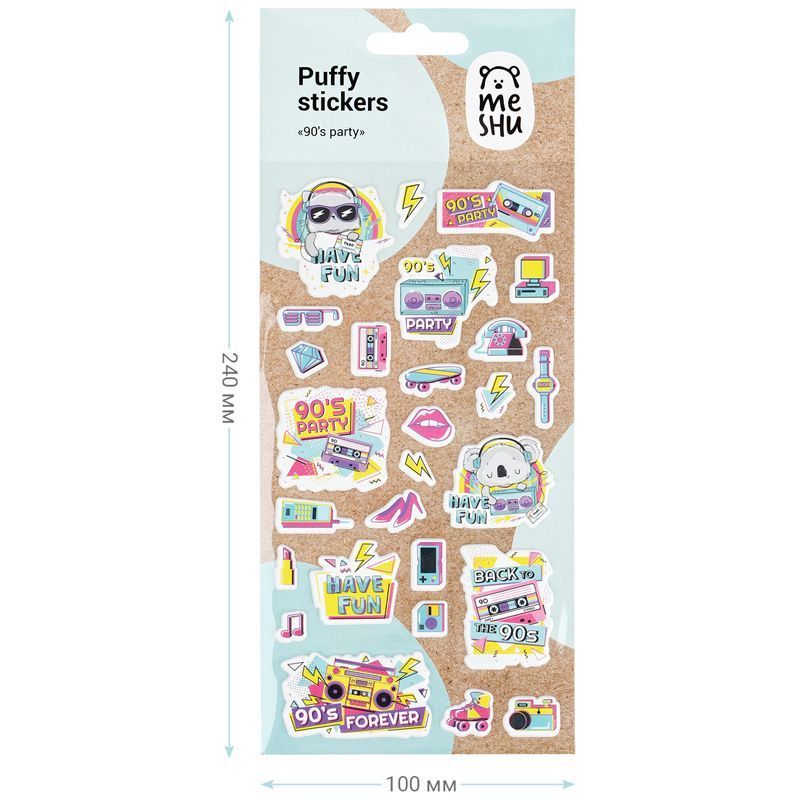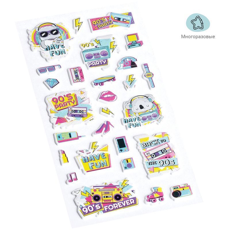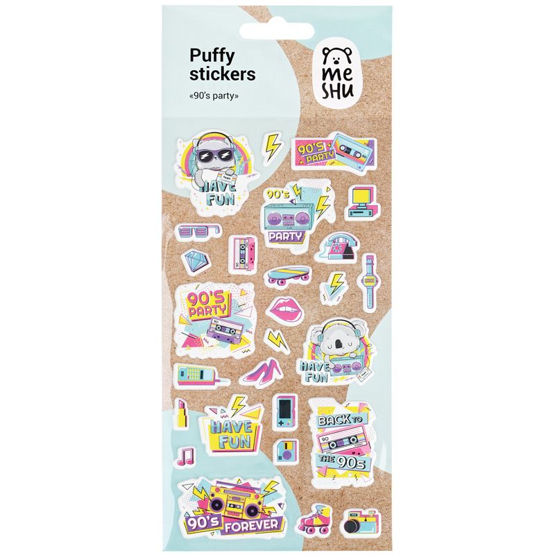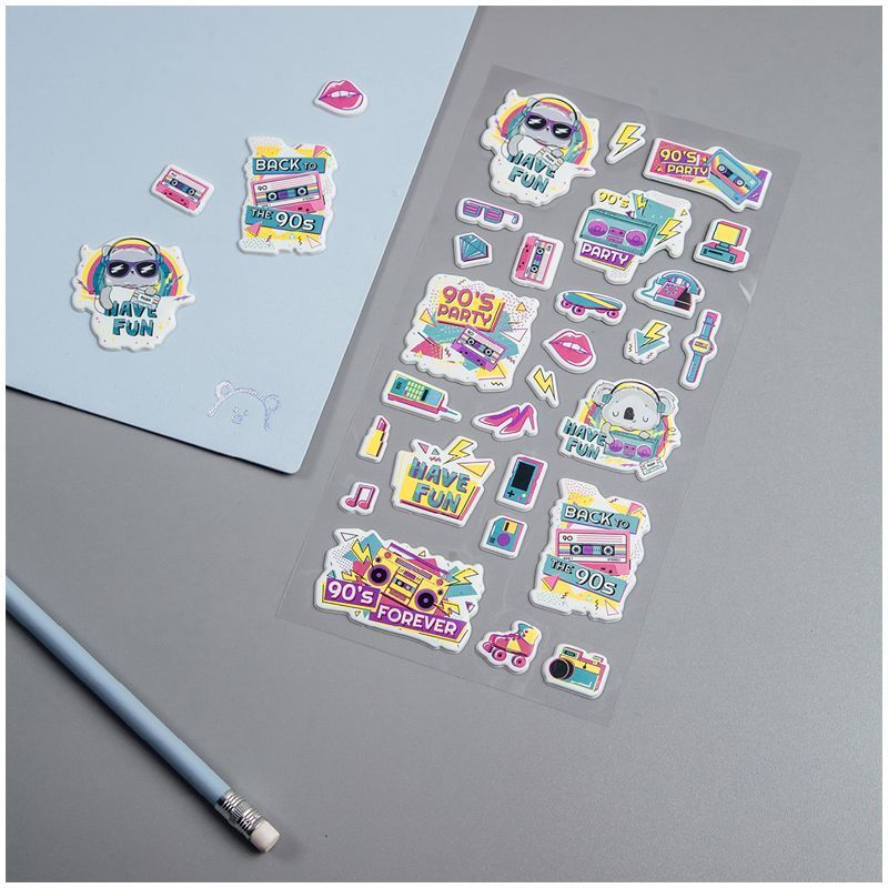 Яркие объёмные наклейки для декорирования MESHU 90's party идеально подходят для украшения любых поделок. Наклейки выполнены в молодёжной и популярной тематике 90-х. Лист с наклейками представлен в размере 10 x 19 см. В упаковке от 27 объёмных наклеек, изготовленных из вспененных полимеров.