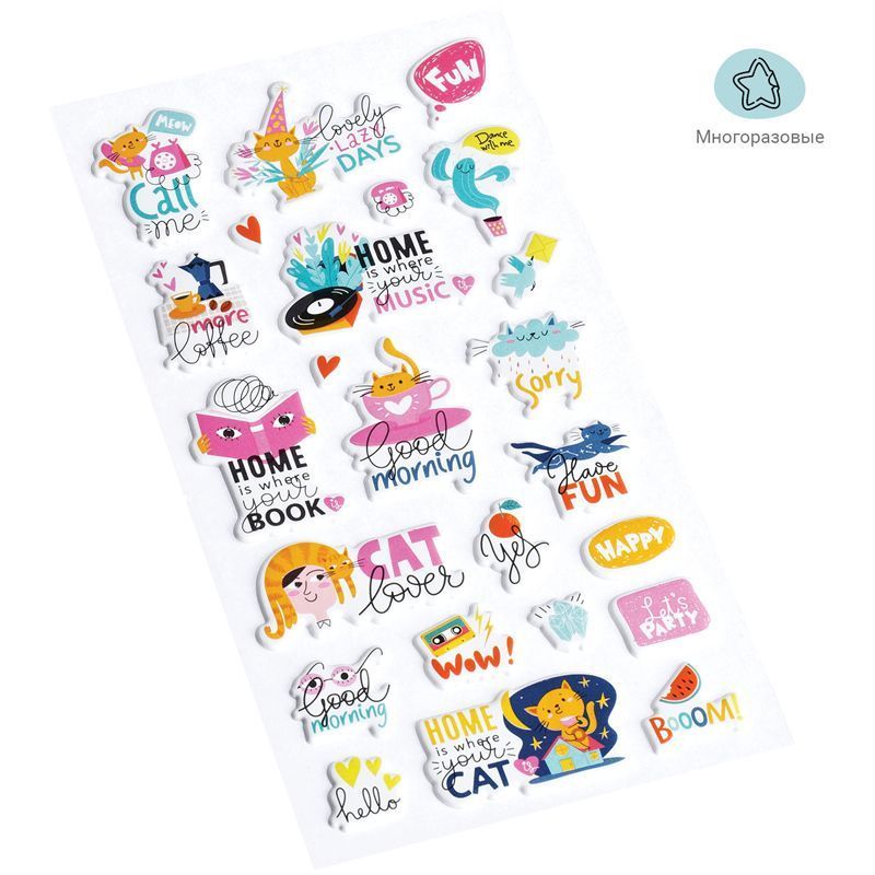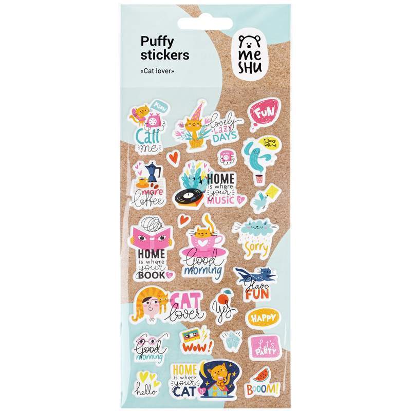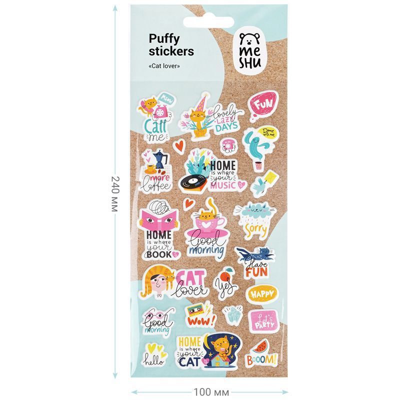 Наклейки MESHU можно приклеить на открытку, подарочную упаковку, обложку ежедневника или тетради, предметы интерьера, мобильный телефон, ноутбук или любой другой аксессуар. Легко отделяются от основы и надежно держатся, а также их можно отклеить от одной поверхности и использовать повторно, ведь они многоразовые. Набор наклеек упакован в пакет с европодвесом.