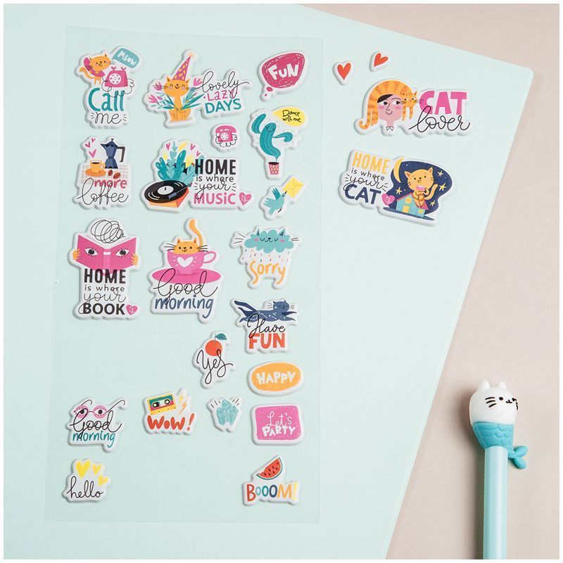 Яркие объёмные наклейки для декорирования MESHU Cat lover идеально подходят для украшения любых поделок и отлично поднимают настроение. Наклейки особенно понравятся любителям дизайнов с изображением милых и забавных котов. Лист с наклейками представлен в размере 10 x 24 см. В упаковке от 24 объёмных наклеек, изготовленных из вспененных полимеров.
