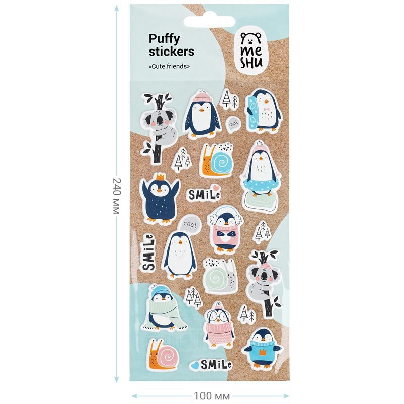 Яркие объёмные наклейки для декорирования MESHU Cute friends идеально подходят для украшения любых поделок и отлично поднимают настроение. Наклейки выполнены в милом дизайне с забавными пингвинами и коалами. Лист с наклейками представлен в размере 10 x 19 см. В упаковке 23 объёмных наклейки, изготовленных из вспененных полимеров.