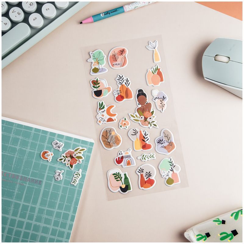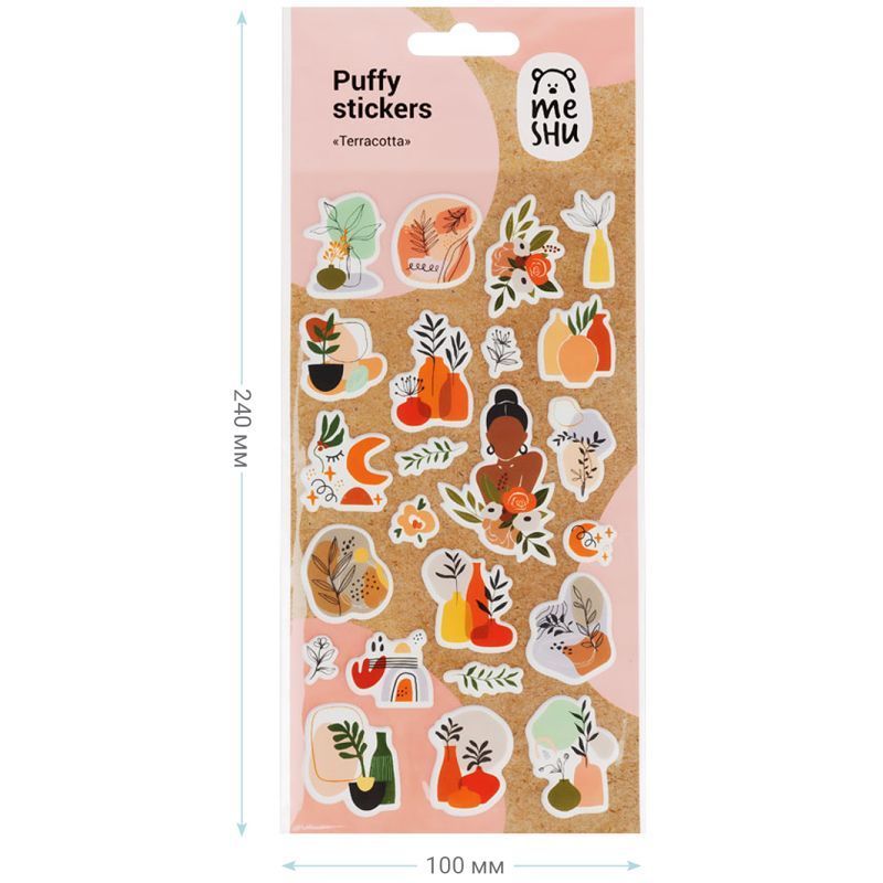 Яркие объёмные наклейки для декорирования MESHU Terracotta идеально подходят для украшения любых поделок и отлично поднимают настроение. Наклейки выполнены в стильном трендовом дизайне. Лист с наклейками представлен в размере 10 x 19 см. В упаковке от 23 объёмных наклеек, изготовленных из вспененных полимеров.