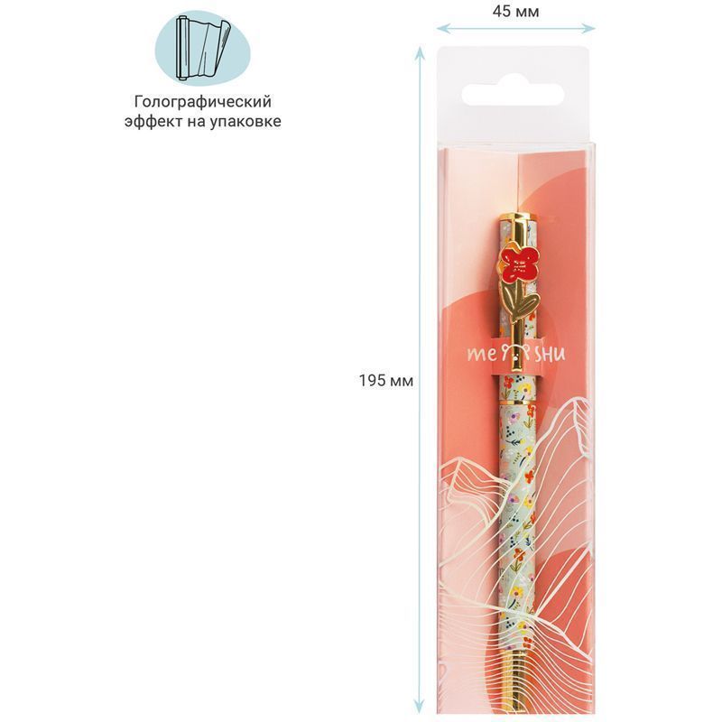 Пастельно-зеленый корпус ручки с паттерном из луговых цветов из металла украшен ярким цветком на клипе, с помощью которого ручку можно закрепить на одежде или ежедневнике.