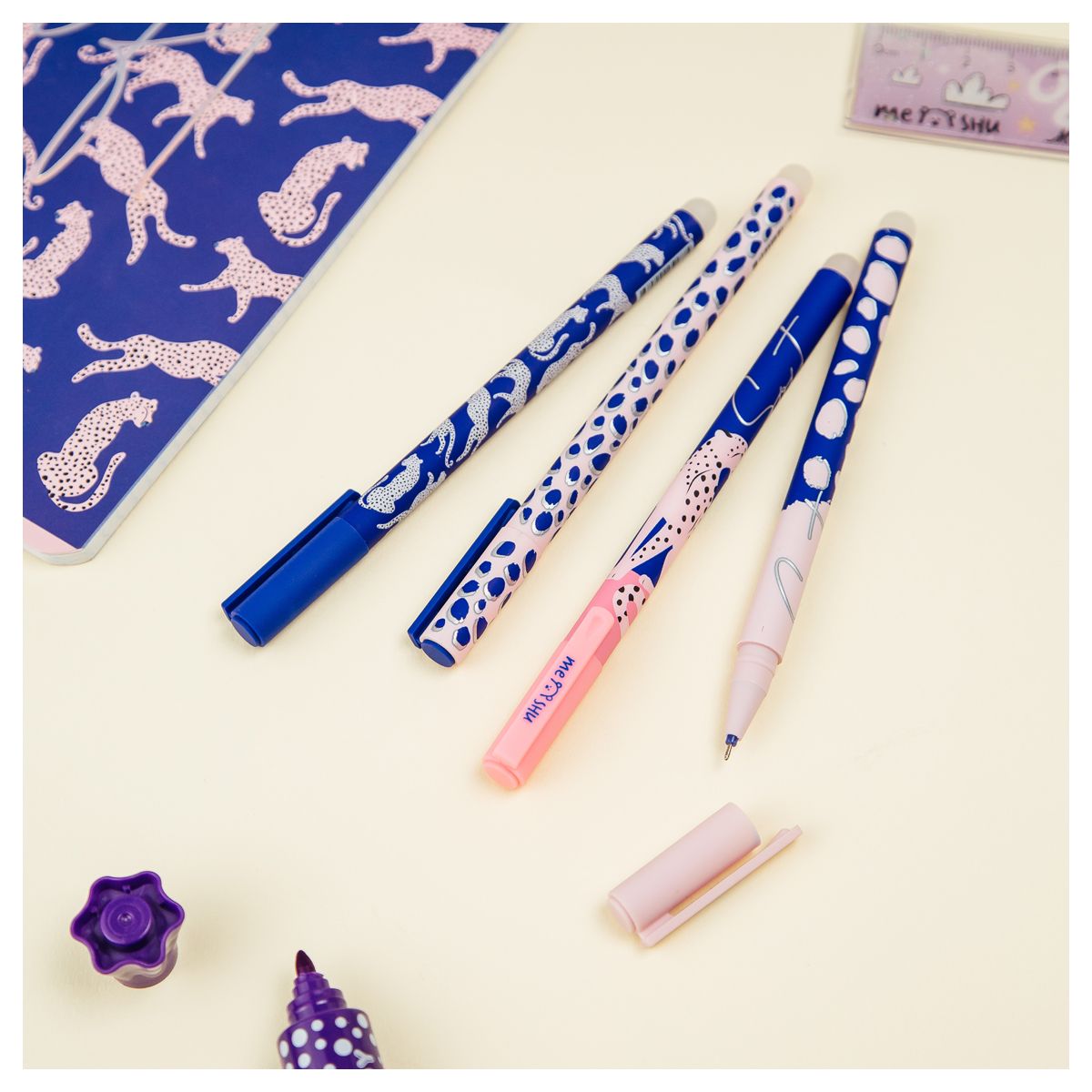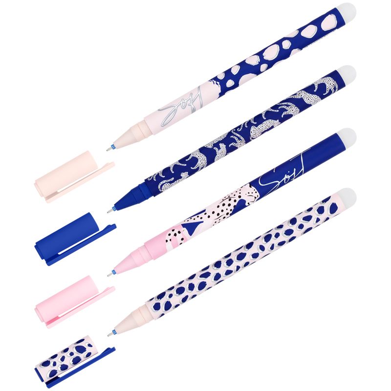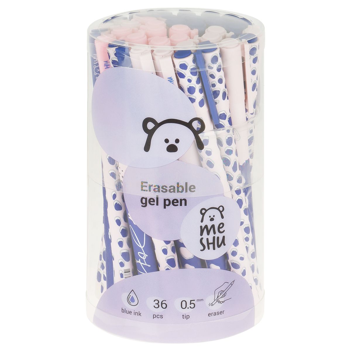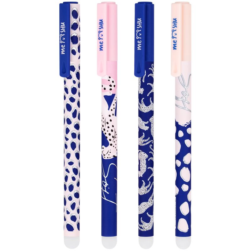 Гелевая ручка MESHU – это яркий дизайн с уникальными стираемыми чернилами внутри. Диаметр игольчатого пишущего узла – 0,5 мм, благодаря чему получается тонкая и аккуратная линия. Длина сменного стержня 129 мм. Гелевые чернила синего цвета не только ярко пишут на бумаге, но и при воздействии температуры становятся невидимыми. Достаточно потереть написанное ластиком на кончике ручки. Обесцвеченные чернила проявляются при низкой температуре. Благодаря колпачку с клипом можно закрепить ручку на одежде или тетради.