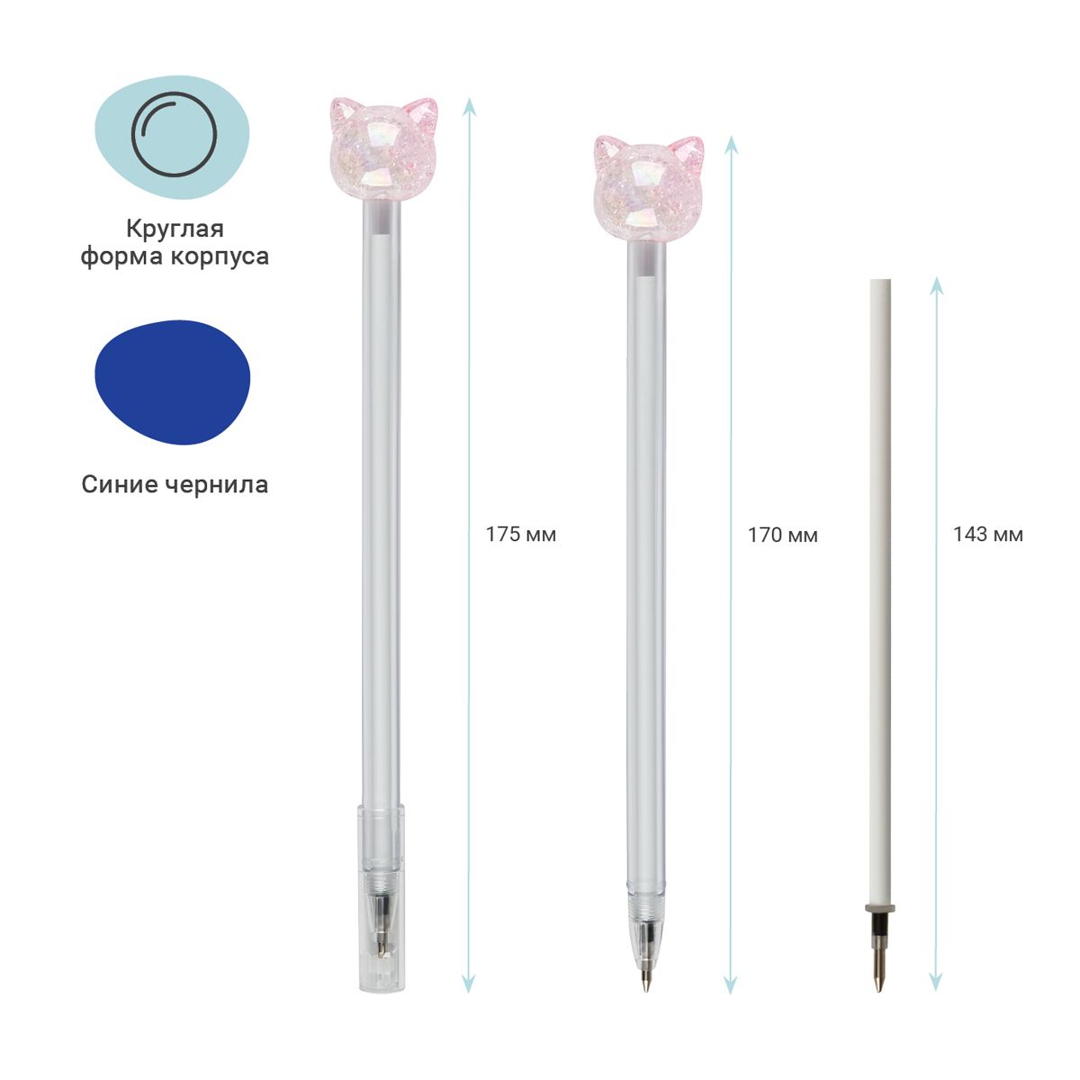 Диаметр пишущего узла – 0,7 мм. Ручка прекрасно подойдёт для мягкого и быстрого письма. Толщина линии письма – 0, 5 мм, а длина письма может достигать от 450 до 500 метров. Ручка обладает необычным дизайном: круглый корпус белого цвета дополняет милая игрушка-кристальный котик. У ручки есть пластиковый колпачок, который гарантирует, что изделие не повредится в сумке и не оставит следов на посторонних предметах. Благодаря чернилам синего цвета ручку можно ежедневно использовать в работе или учёбе. Изделие предусматривает возможность замены стержня длиной 126 мм. Ручки упакованы в картонную коробку-дисплей.