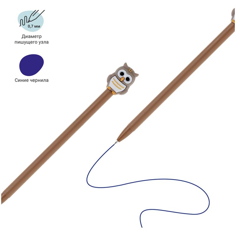 Пластиковый корпус ручки дополняет игрушечная сова в конце изделия. Диаметр пишущего узла составляет 0,7 мм, а значит ручка подойдёт для мягкого и быстрого письма. Толщина линии составляет 0,5 мм. Ручка не имеет кнопочного механизма, но обладает пластиковым колпачком. Это говорит о надёжности и безопасности изделия – стержень не повредится в сумке и не оставит следов на посторонних предметах. Благодаря чернилам синего цвета ручку можно использовать в работе или учёбе на постоянной основе. Чернила сменные, что говорит о долговечности изделия.