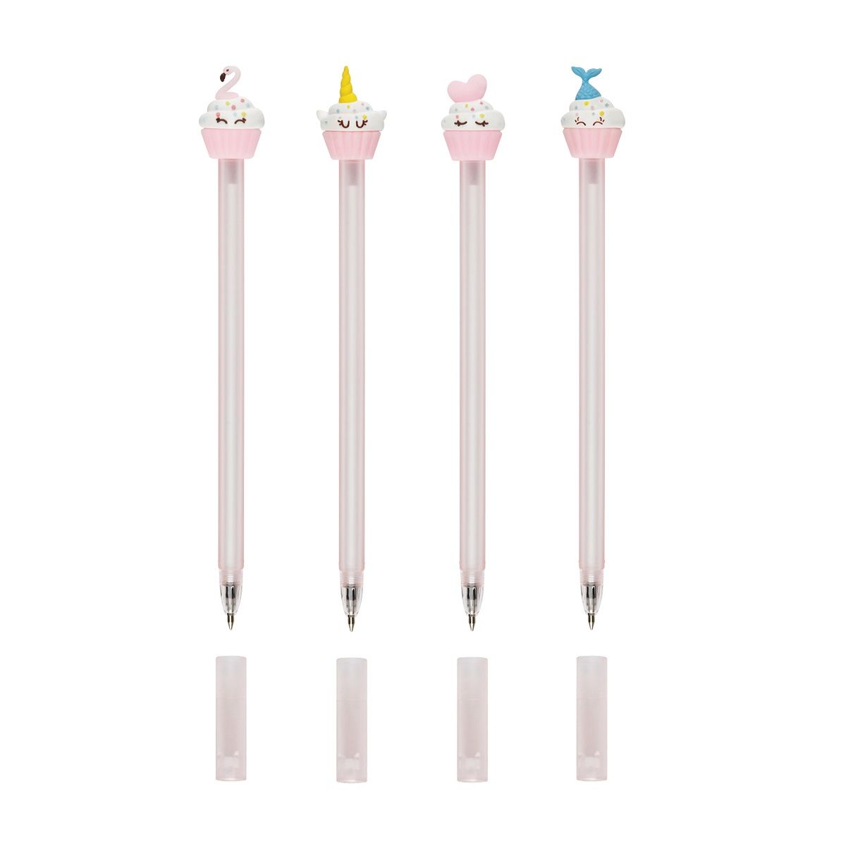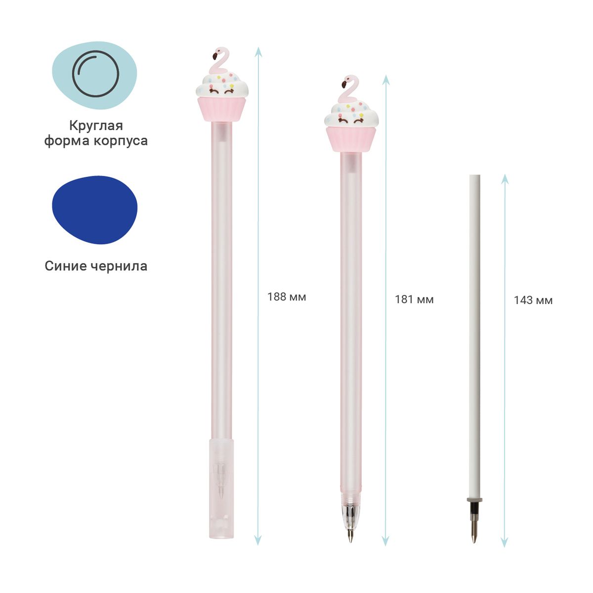 Диаметр пишущего узла – 0,7 мм. Ручка прекрасно подойдёт для мягкого и быстрого письма. Толщина линии письма – 0, 5 мм, а длина письма может достигать от 450 до 500 метров. Ручка обладает необычным дизайном: корпус нежно-розового цвета дополняет милая игрушка-пирожное. У ручки есть пластиковый колпачок, который гарантирует, что изделие не повредится в сумке и не оставит следов на посторонних предметах. Благодаря чернилам синего цвета ручку можно ежедневно использовать в работе или учёбе. Изделие предусматривает возможность замены стержня длиной 115 мм. Ручки упакованы в картонную коробку-дисплей.