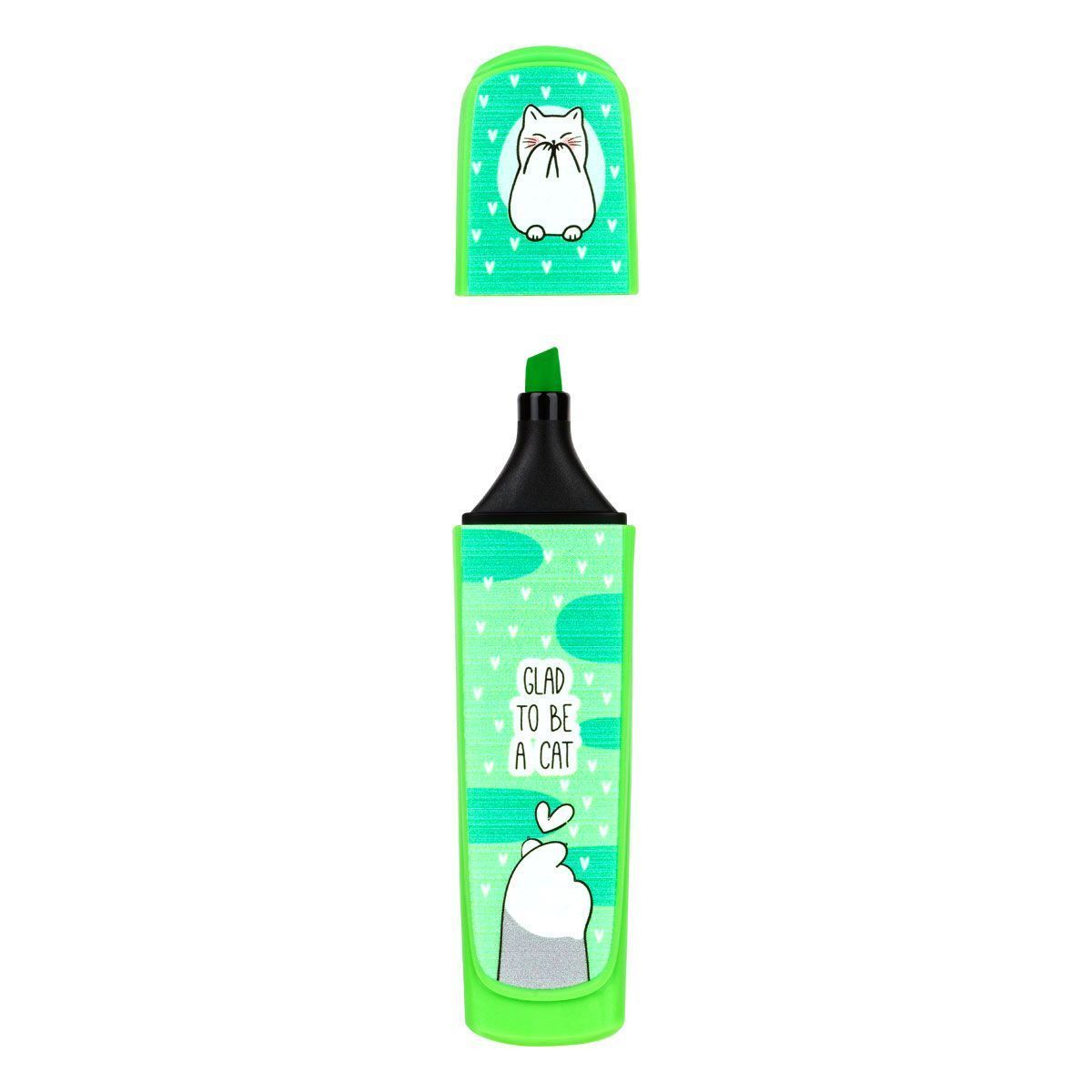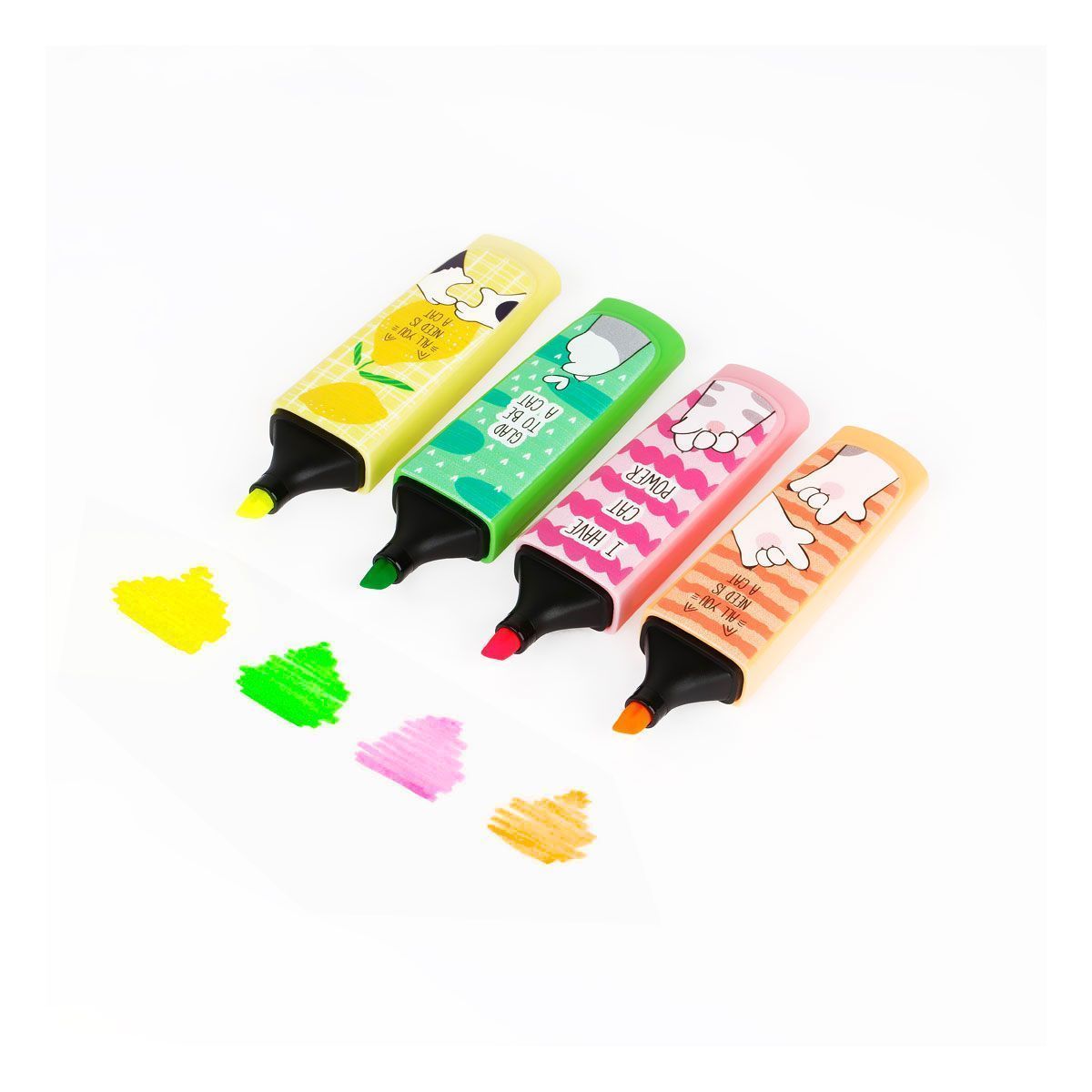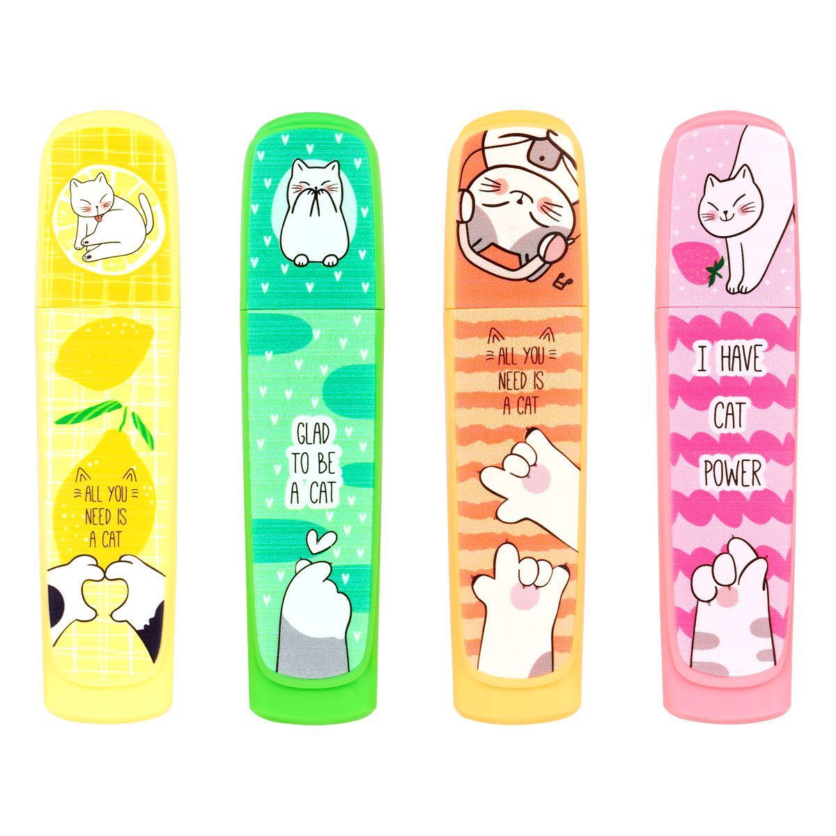 Текстовыделители с изображениями котиков в японском стиле и забавными надписями созданы поднимать настроение на работе или учёбе. В наборе – четыре ярких оттенка чернил: жёлтый, зелёный, розовый и оранжевый. Цвет колпачка и корпуса соответствует цвету чернил. Текстовыделители упакованы в ПВХ-бокс с европодвесом по 4 шт.