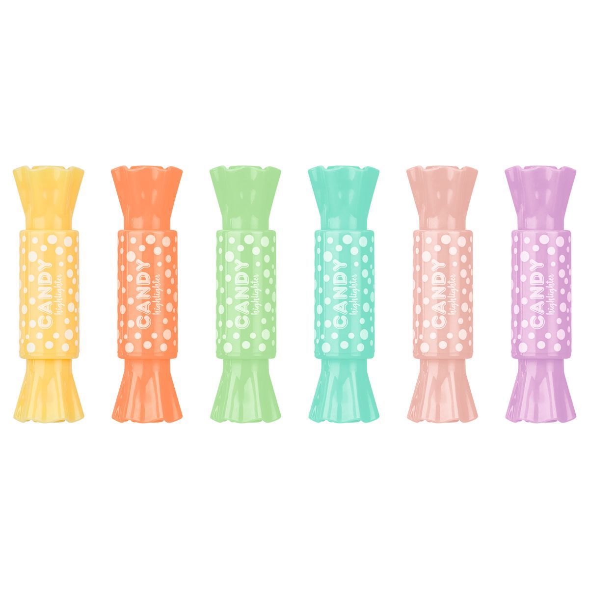 Представлено шесть пастельных текстовыделителей в форме сладостей: жёлтый, розовый, зелёный, голубой, оранжевый, фиолетовый.