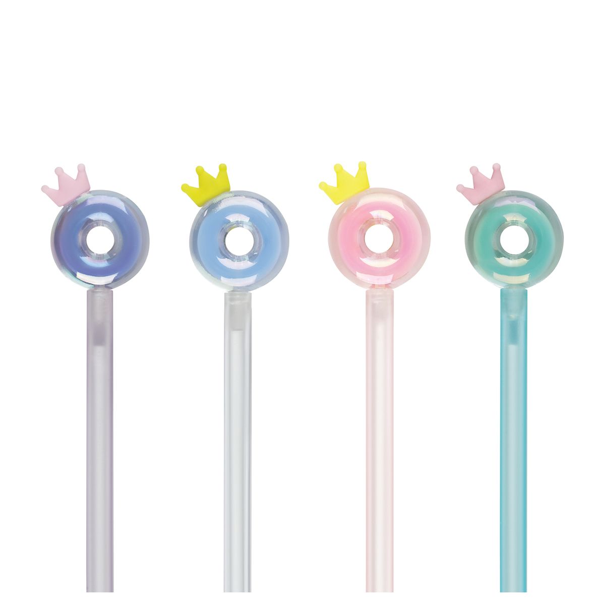 Ручка обладает необычным дизайном: круглый корпус нежных цветов дополняет милая игрушка-кристальный пончик в милой короне.