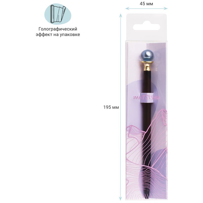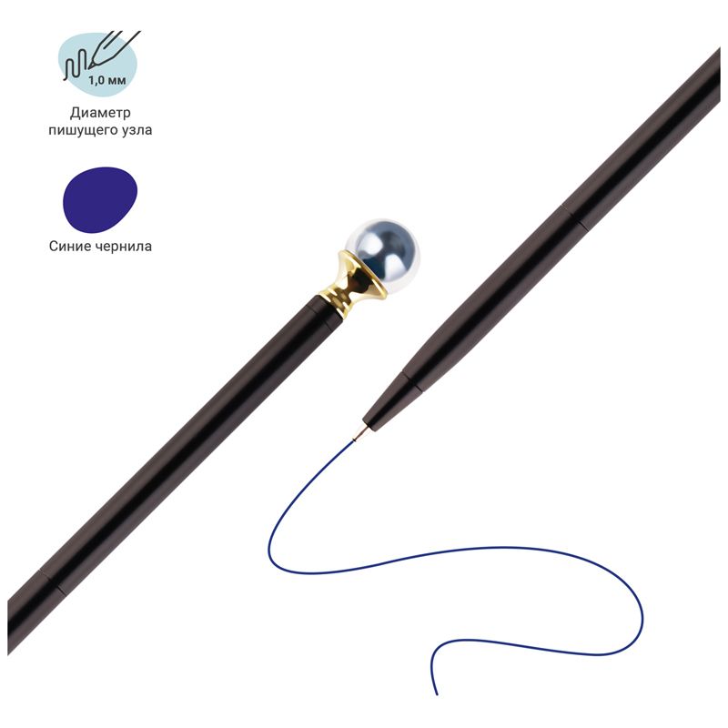 Диаметр пишущего узла: 1 мм. Ручка подойдёт для мягкого и быстрого письма. Чёрный корпус ручки из металла с матовым эффектом украшен серой перламутровой жемчужиной на золотом пьедестале.