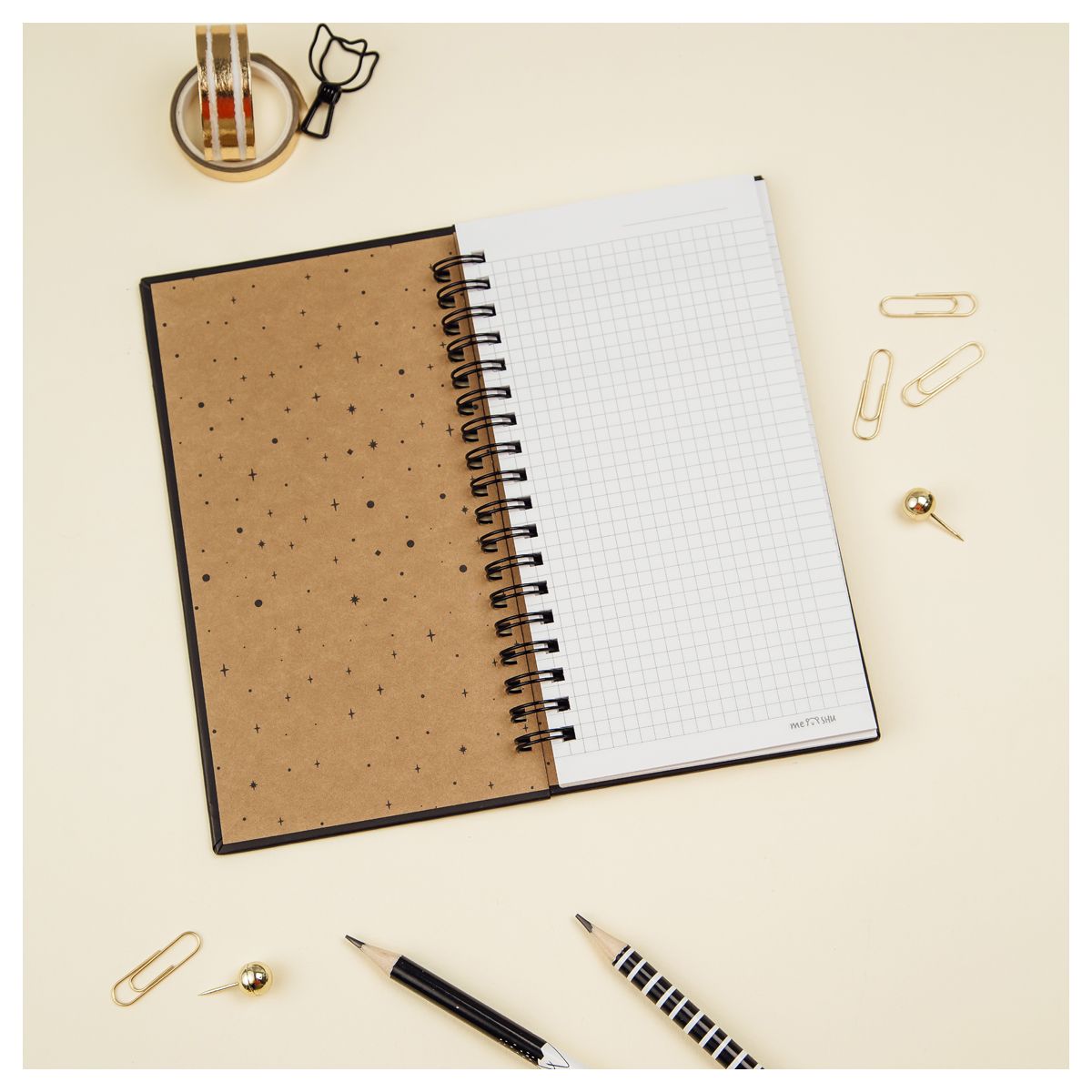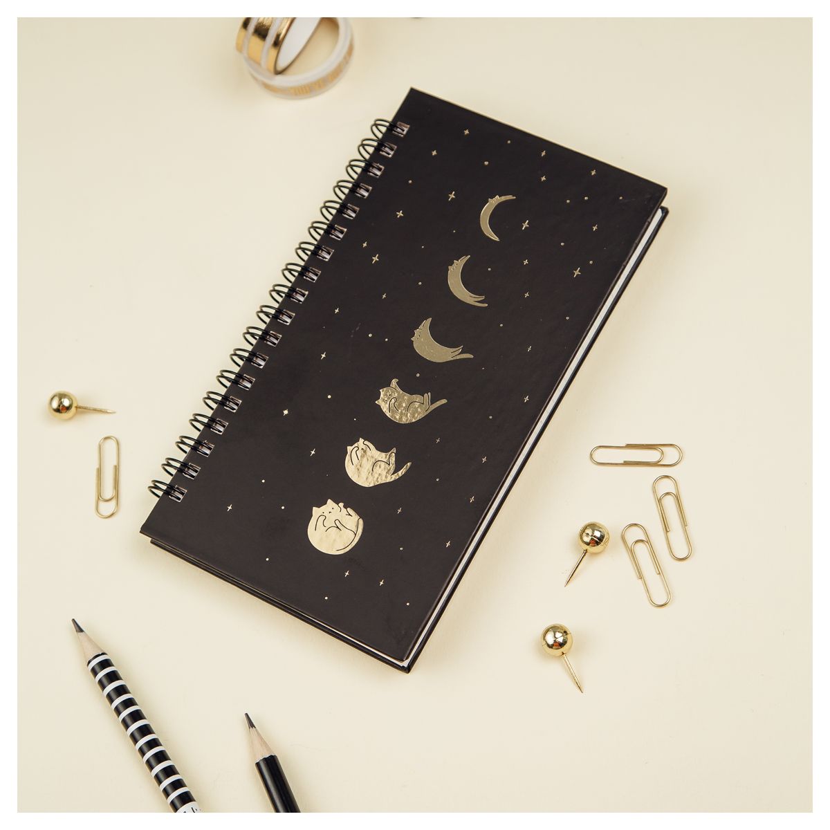 В обложке из твёрдого картона используется матовая ламинация и тиснение фольгой. На ней изображены космические объекты в свойственном бренду милом стиле: магические котики как фазы Луны.