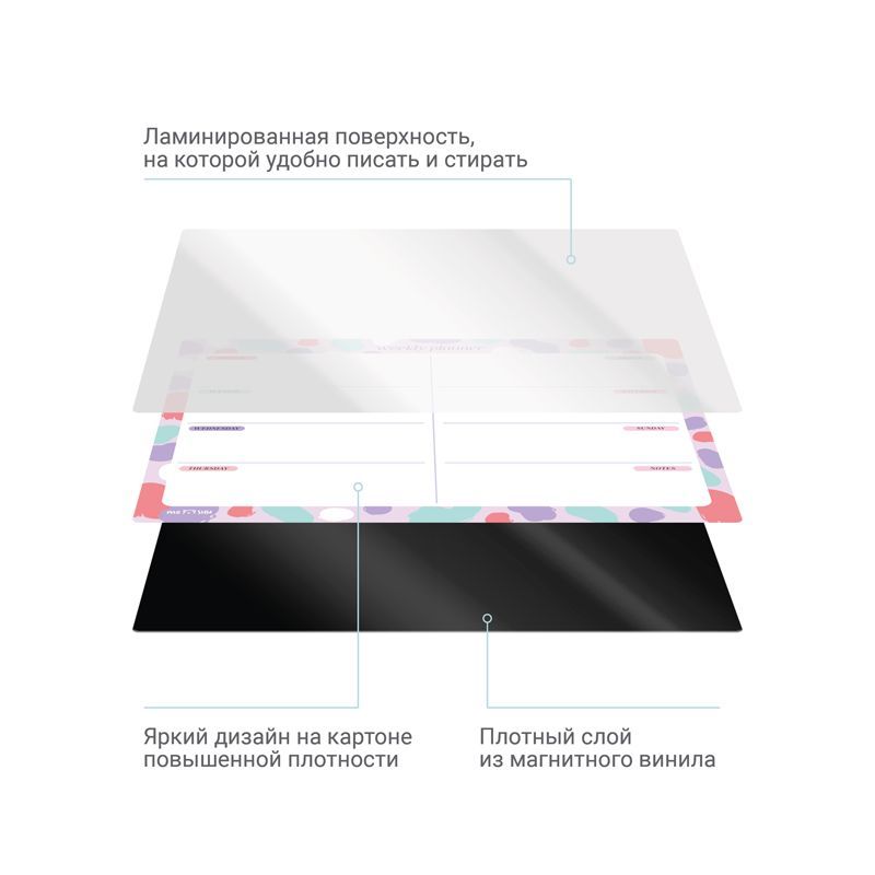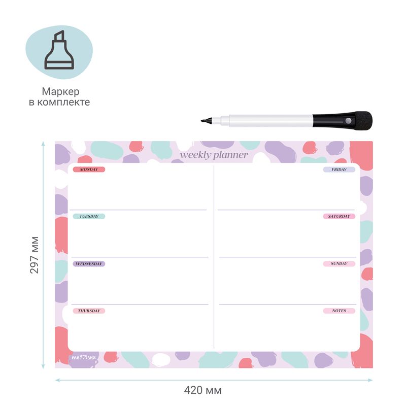 Планер формата А3 выполнен из картона плотностью 200 г/м2, покрытого магнитным винилом. Ламинация позволяет многократно писать и стирать надписи. Размер магнитного расписания – 297*420 мм. В комплекте прилагается маркер на магните со стирателем, которым очень удобно корректировать записи и крепить его к любой металлической поверхности (например, к холодильнику). Внимание! Используйте только маркер на водной основе. Для очистки поверхности используйте влажную салфетку. Планер выполнен в универсальном оригинальном дизайне. Он поможет запомнить задачи, спланировать расписание и встречи с коллегами, друзьями или семьёй.