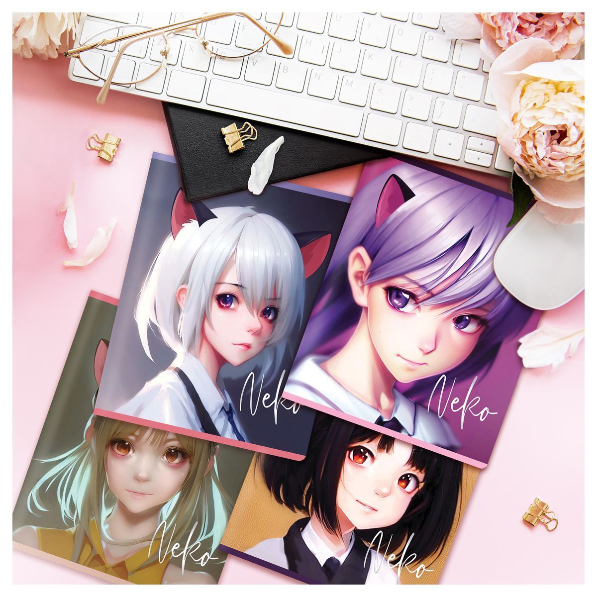 Необычное и яркое исполнение тетрадей MESHU Neko − отличительная черта бренда, а дополнительные листы, на которых удобно записывать важные заметки, являются логичным продолжением общего дизайна тетради. Внутренний блок изделия состоит из 48 листов в клетку с полями формата A5 на офсетной бумаге плотностью 65 г/м², белизна которой составляет 100%. Обложка тетради из импортного целлюлозного картона выделяется ярким дизайном и цветной запечаткой форзаца. Отделка обложки – soft-touch-ламинация, тиснение фольгой.