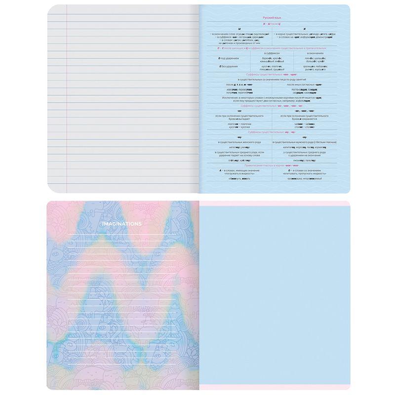 - Листы со справочной информацией яркие и являются продолжением дизайна обложки тетради.