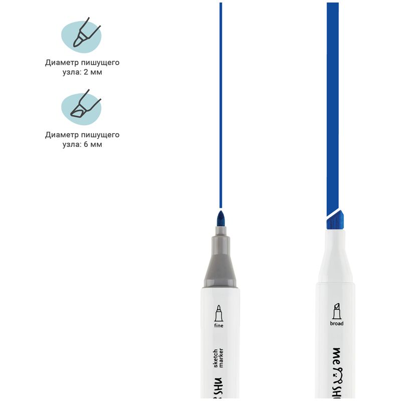 • Маркеры обладают пулевидным (2 мм) и скошенным (6 мм) наконечниками, что позволяет прорабатывать как мелкие детали рисунка. так и закрашивать большие области.