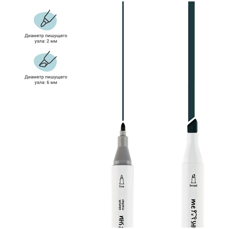 • Маркеры обладают пулевидным (2 мм) и скошенным (6 мм) наконечниками, что позволяет прорабатывать как мелкие детали рисунка, так и закрашивать большие области.